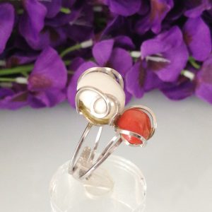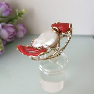 Anello corallo rosso del mediterraneo naturale. Anello perla barocca bianca .Anello argento.