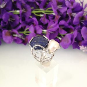 Anello perla naturale barocca e pietra vera Lapislazzuli blu Anello argento.