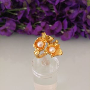Anello perla naturale bianca barocca.Anello 3 perle.Anello foglia oro.