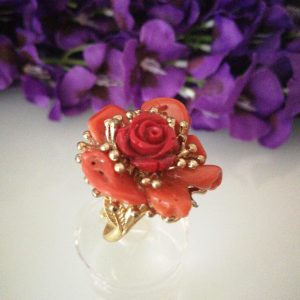 Anello corallo rosso del mediterraneo naturale e rosa rossa .Anello fiore di corallo.
