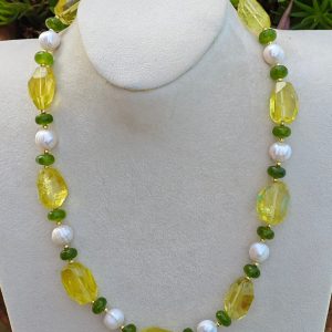 Collana pietre dure quarzo citrino, peridoto e perle bianche, collana girocollo, collana moderna Ag 925
