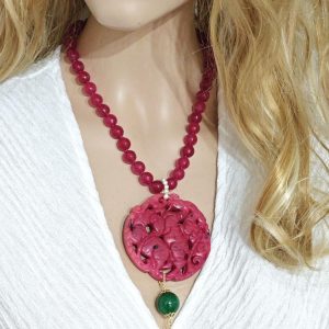 Collana pietre dure agata rosa, perle bianche barocche e pendente mandala giada itagliata