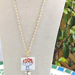 Collana piastrella ceramica di Caltagirone con perle bianche , collana rosario siciliana