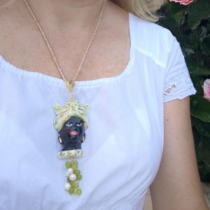 Collana perle verde e marrone con testa di moro in ceramica di Caltagirone, collana siciliana