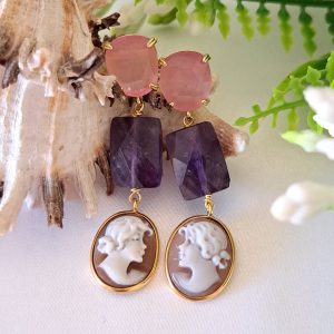 Orecchini  cammeo conchiglia sardonica e pietre dure ametista e quarzo rosa , gioielli italiani