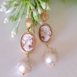 Orecchini cammeo conchiglia sardonica e perle barocche bianche, orecchini argento 925 , gioielli italiani