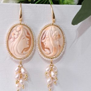 Orecchini cammeo conchiglia sardonica con grappolo perle bianche , gioielli italiani
