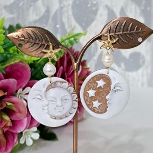 Orecchini cammeo Sole e Luna in conchiglia sardonica e argento 925 placcato oro, gioielli italiani