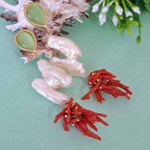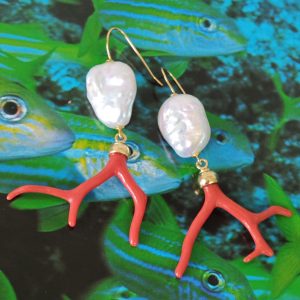 Orecchini corallo rosso naturale e perle barocche bianche , gioielli italiani