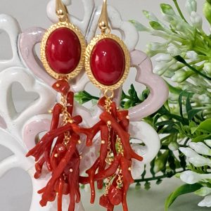 Orecchini corallo rosso naturale, orecchini argento 925 placcato oro , gioielli italiani