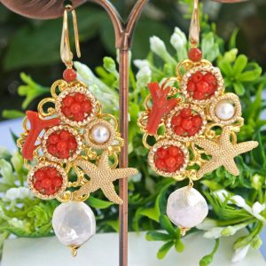Orecchini corallo rosso naturale e perle barocche , orecchini stelle marine argento 925 placcato oro , gioielli italiani