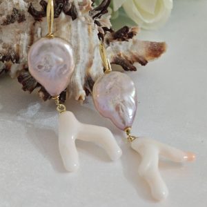 Orecchini  corallo rosa naturale, perle barocche e argento 925 placcato oro, gioielli italiani