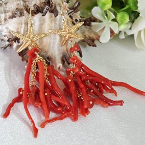 Orecchini corallo rosso naturale mediterraneo , orecchini stelle marine argento 925 placcato oro , gioielli italiani