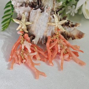 Orecchini corallo rosa salmone naturale, orecchini stelle marine argento 925 placcato oro, gioielli italiani