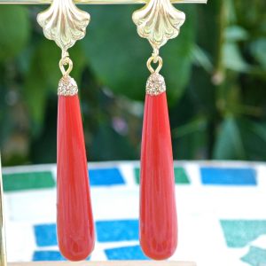 Orecchini goccia corallo rosso con conchiglie argento 925 placcato oro, gioielli italiani