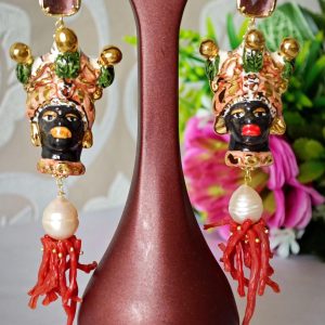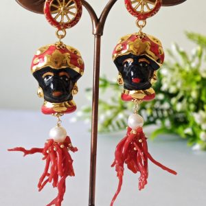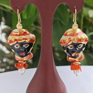 Orecchini teste di moro ceramica Caltagirone , perle pasta di corallo rosso, orecchini siciliani