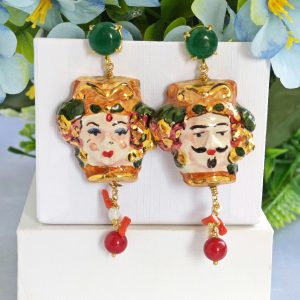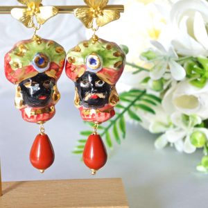Orecchini teste di moro ceramica Caltagirone e corallo rosso mediterraneo, orecchini siciliani