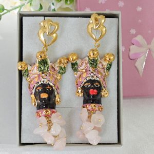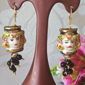 Orecchini ceramica Caltagirone, pietre dure angelite rosa, orecchini teste di moro siciliani