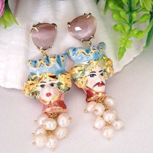 Orecchini teste di moro in ceramica Caltagirone con perle bianche ,corallo rosa naturale e pietre quarzo rosa , orecchini siciliani
