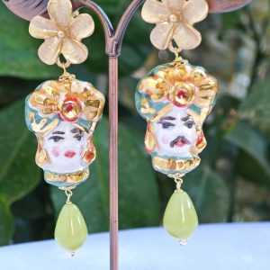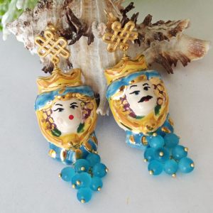 Orecchini ceramica Caltagirone, orecchini pietre quarzo celeste , orecchini teste di moro siciliani