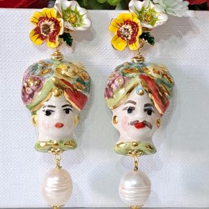 Orecchini ceramica Caltagirone e perle bianche , orecchini teste di moro e fiori smaltati , orecchini siciliani