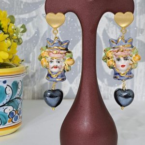 Orecchini teste di moro in ceramica di Caltagirone, orecchini cuore , orecchini siciliani