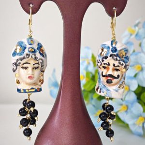 Orecchini teste di moro ceramica Caltagirone con pietre dure onice nero , orecchini siciliani