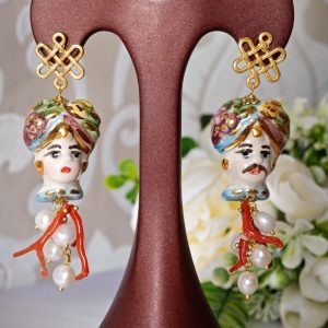 Orecchini pendenti con teste di moro in ceramica Caltagirone, orecchini corallo mediterraneo e perle bianche , orecchini siciliani