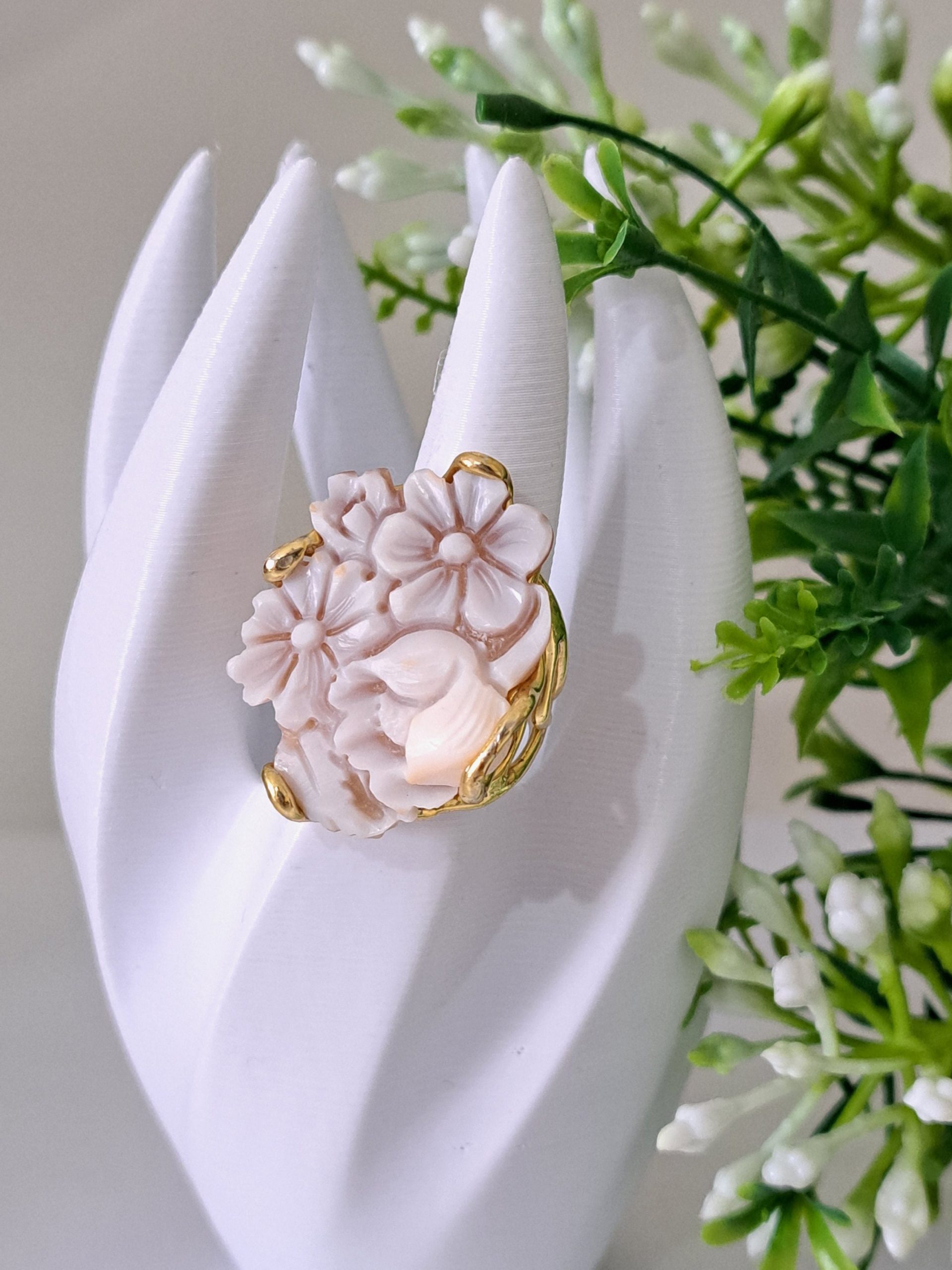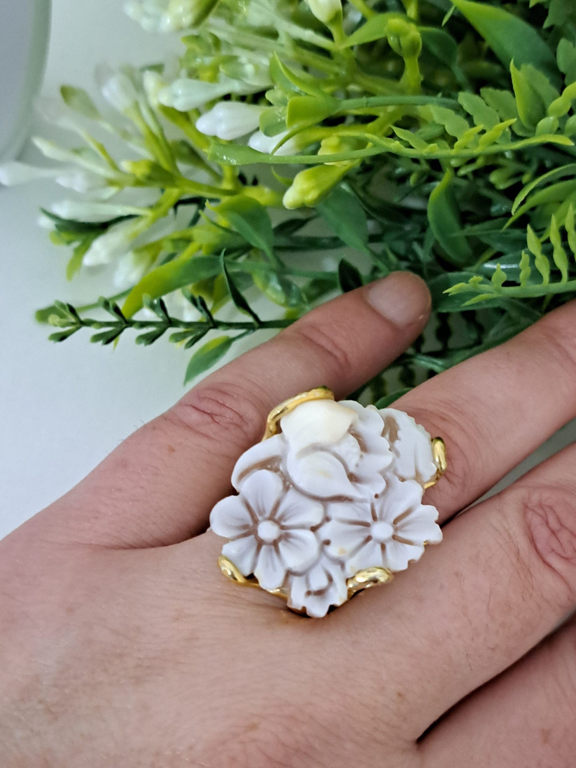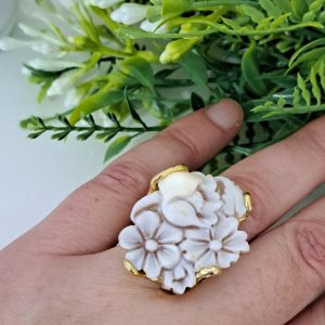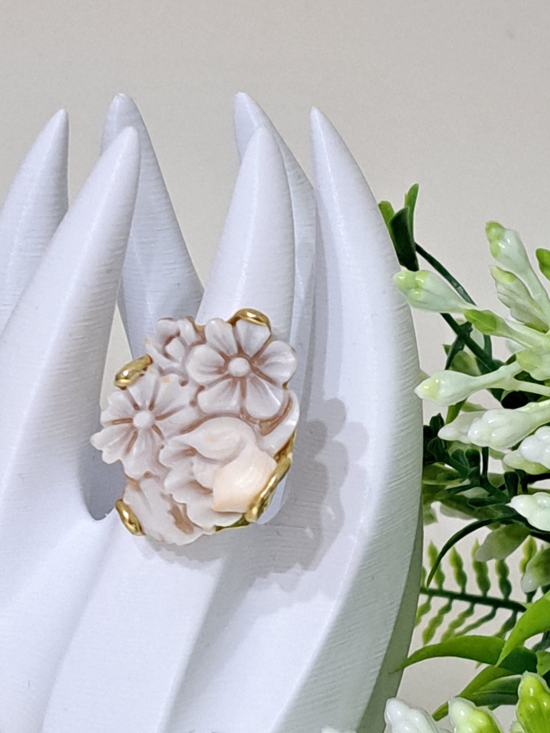 Anello in argento 925 placcato oro con cammeo autentico realizzato a mano in conchiglia sardonica a Torre del greco raffigurante fiori , 30×24 mm dimensioni.