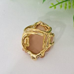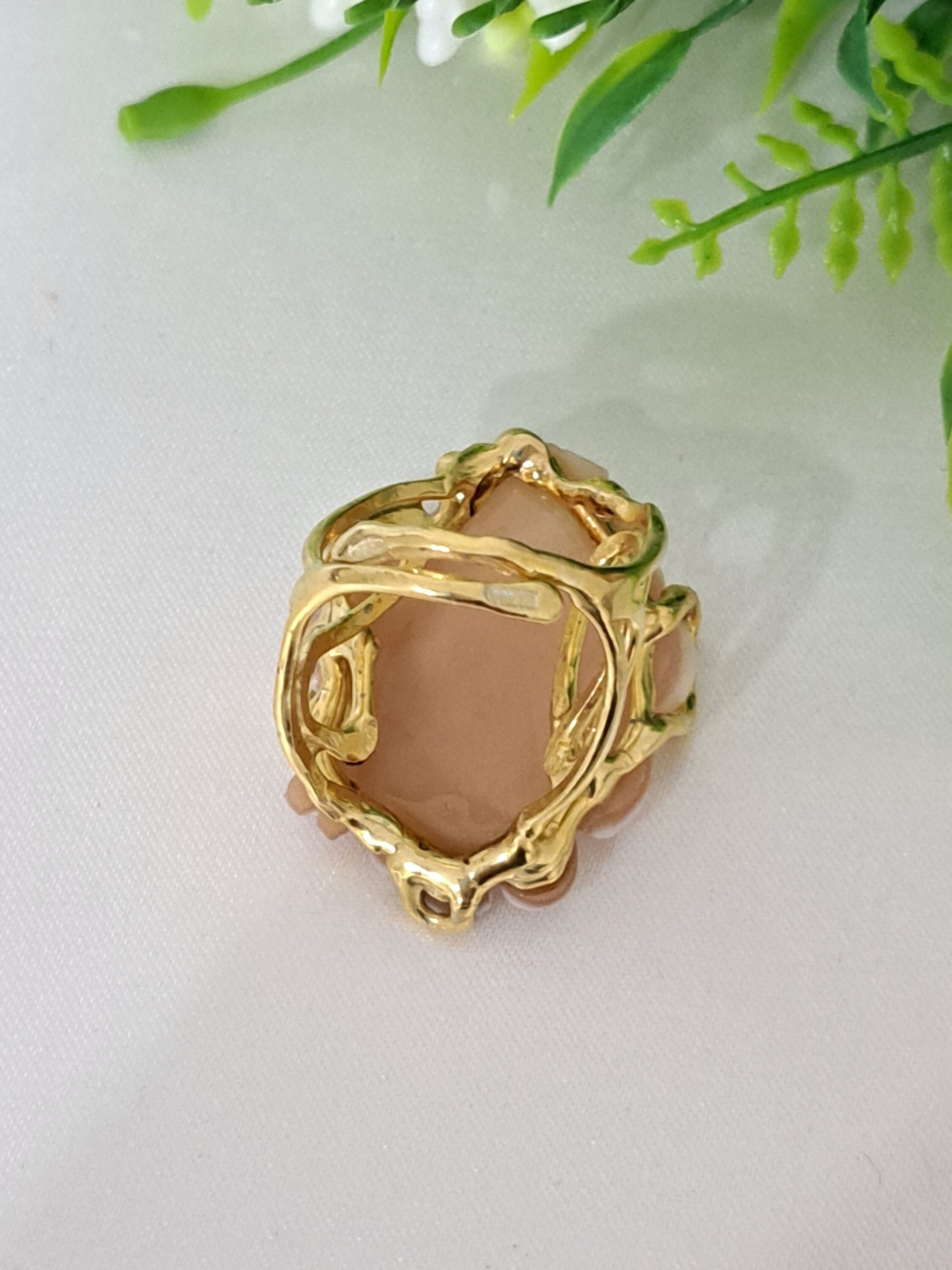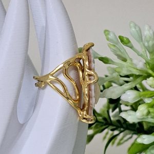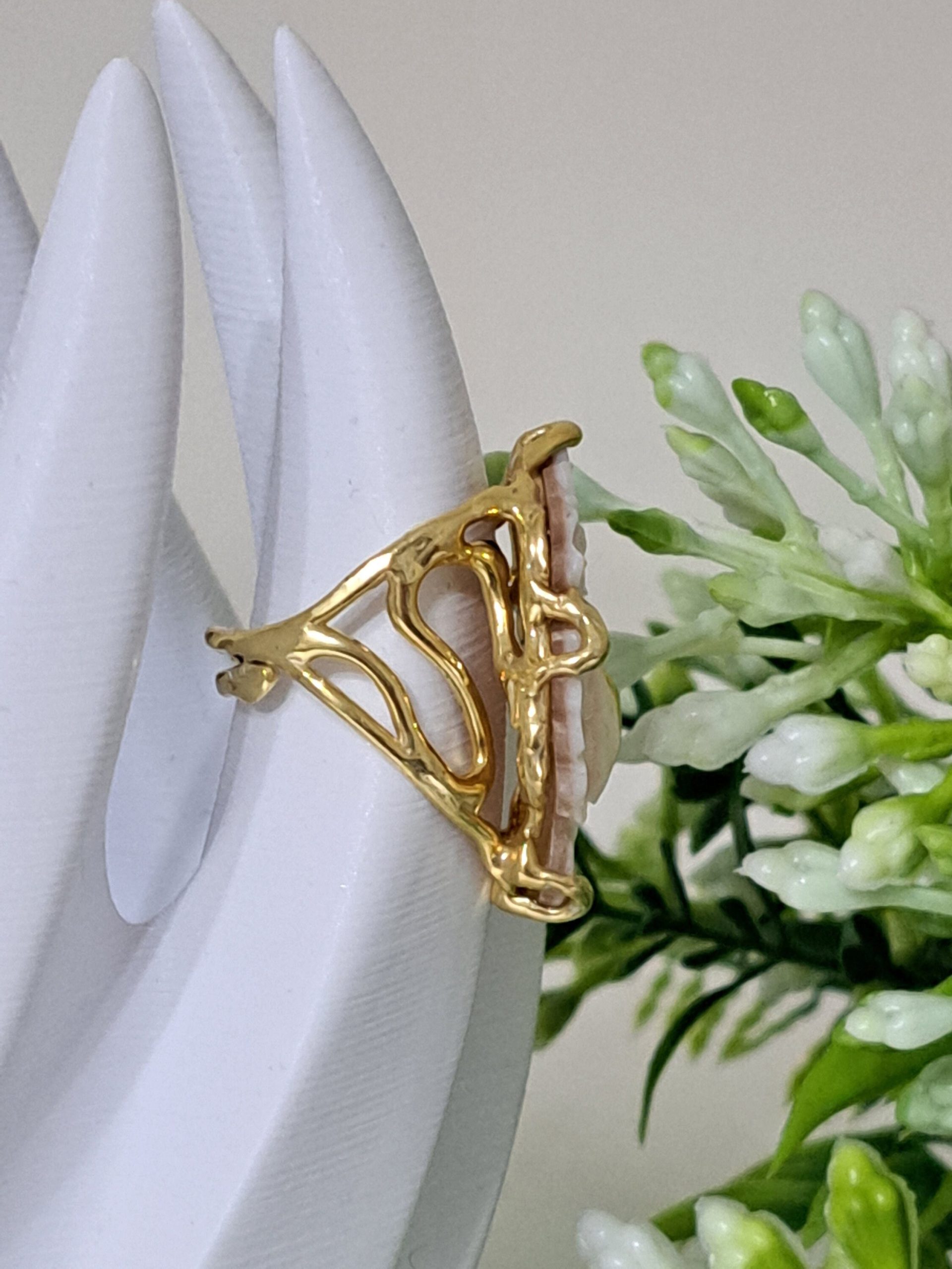 Anello in argento 925 placcato oro con cammeo autentico realizzato a mano in conchiglia sardonica a Torre del greco raffigurante fiori , 30×24 mm dimensioni.