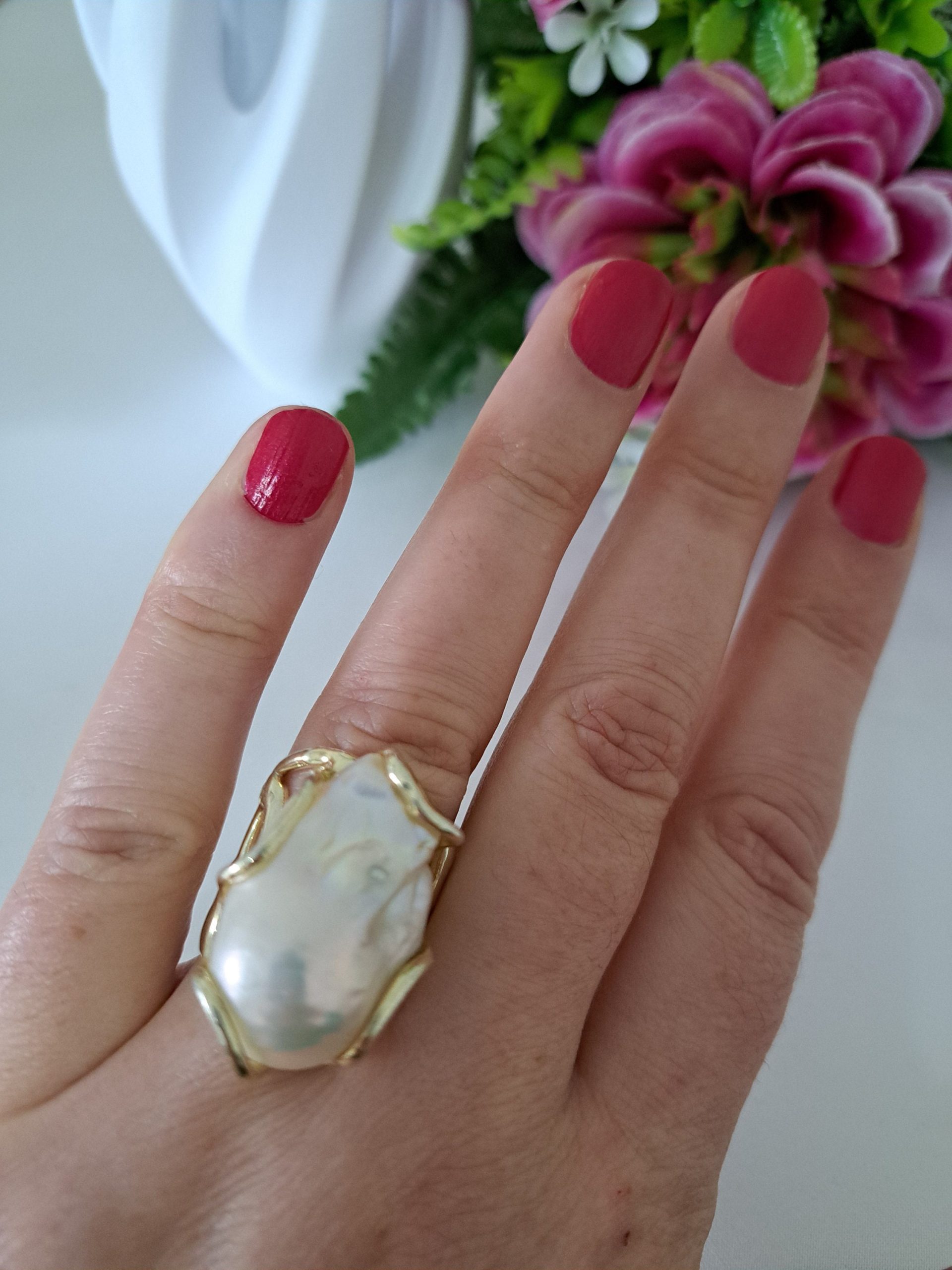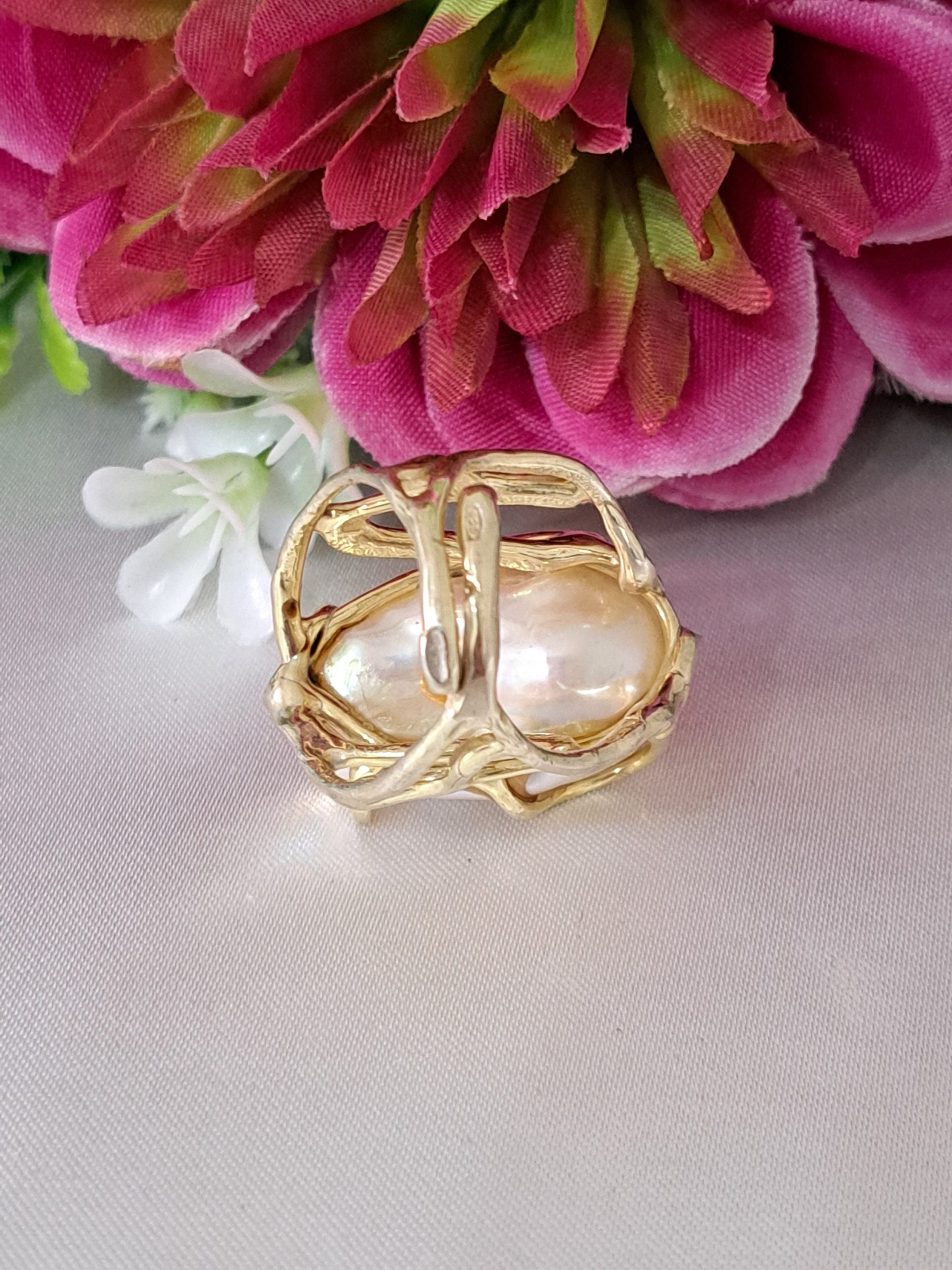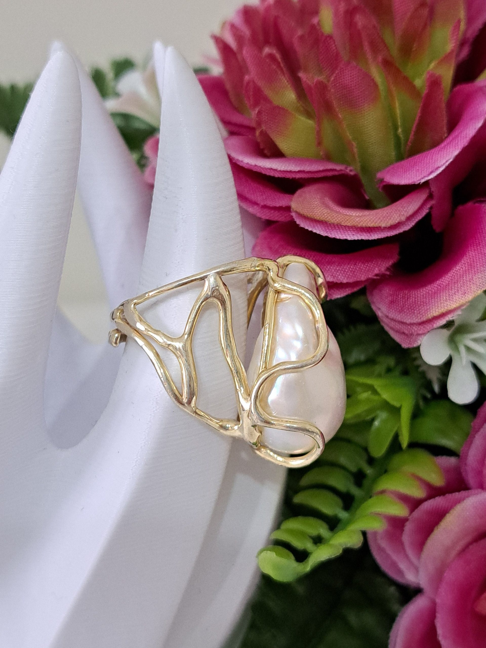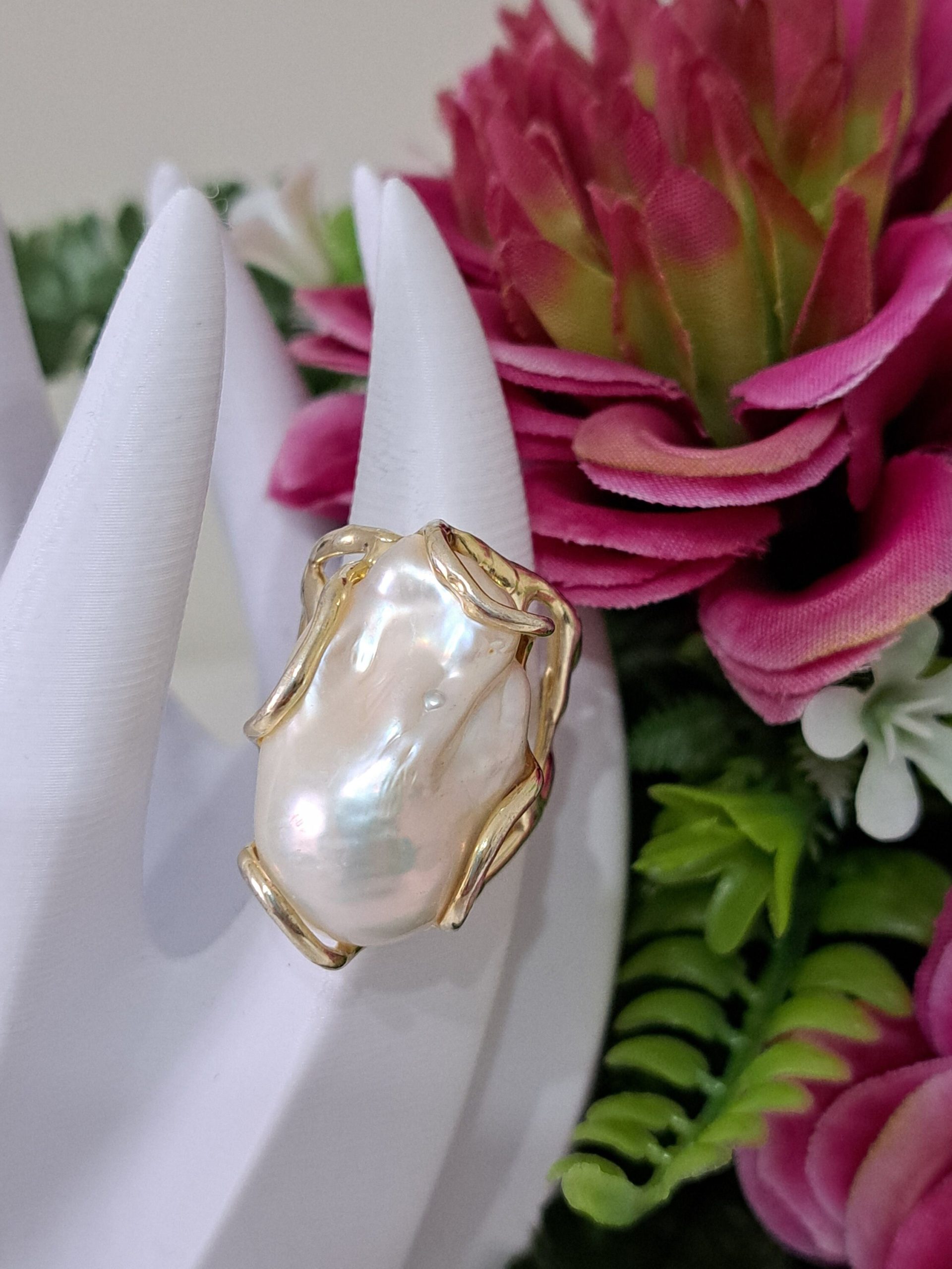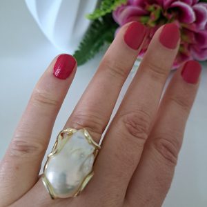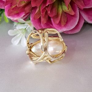 Anello artigianale in argento 925 placcato oro con perla barocca bianca.