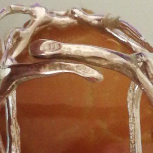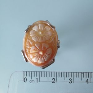 Bellissimo anello con cammeo conchiglia autentico che raffigura fiori, con montatura a lavorazione artigianale incrociata in argento 925 . Misura del cammeo 3×2 cm. Misura anello regolabile.Cammeo perfetto.