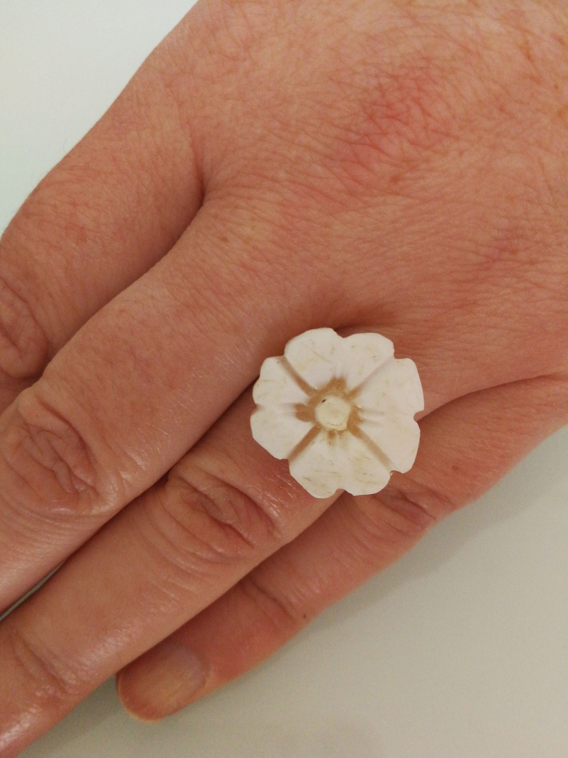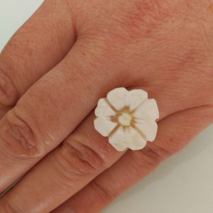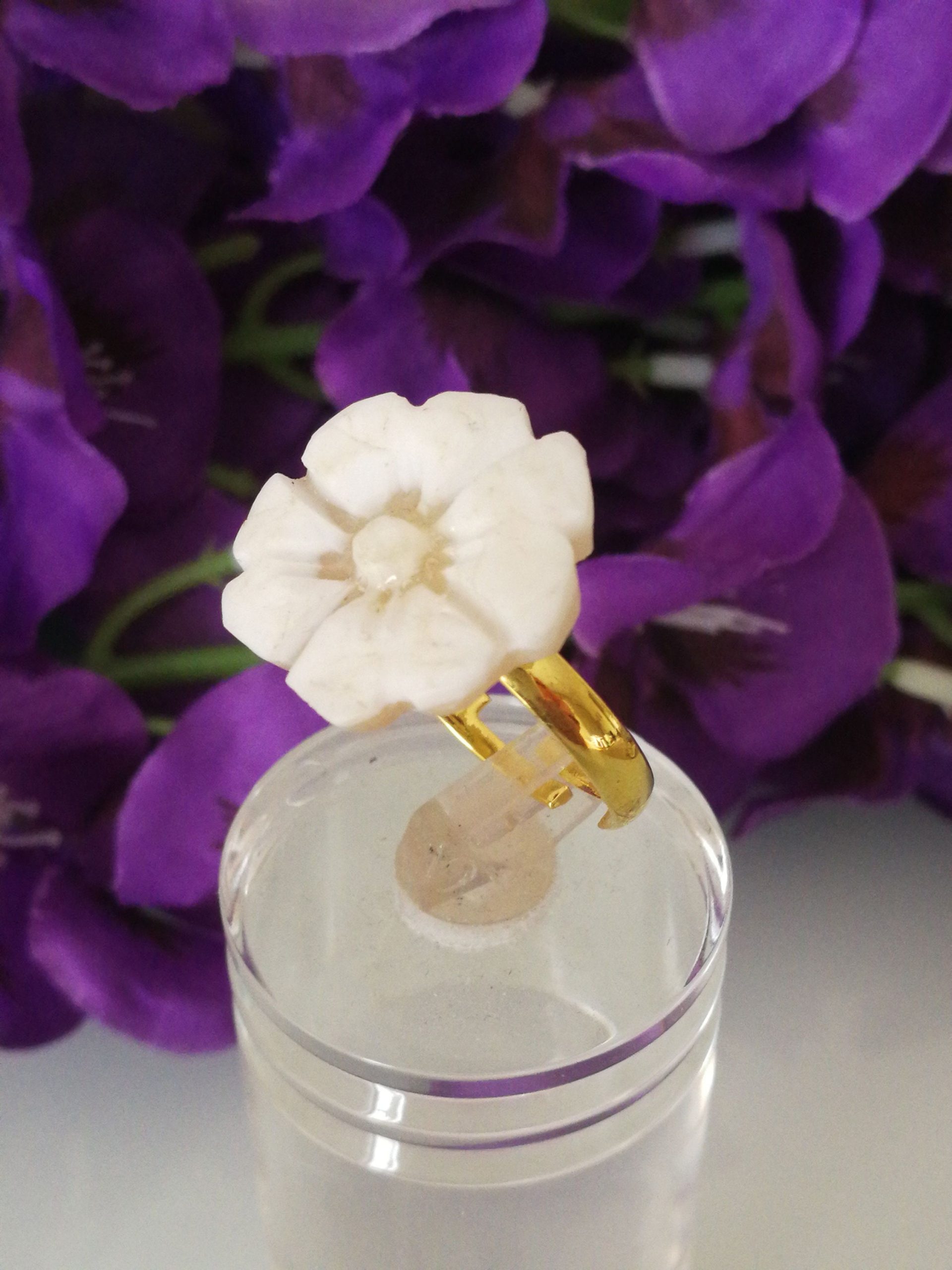 Anello art noveau, con cammeo ,che raffigura fiore , con montatura in ottone dorato a lavorazione artigianale Misura del cammeo lunghezza 2 cm. Misura anello regolabile.