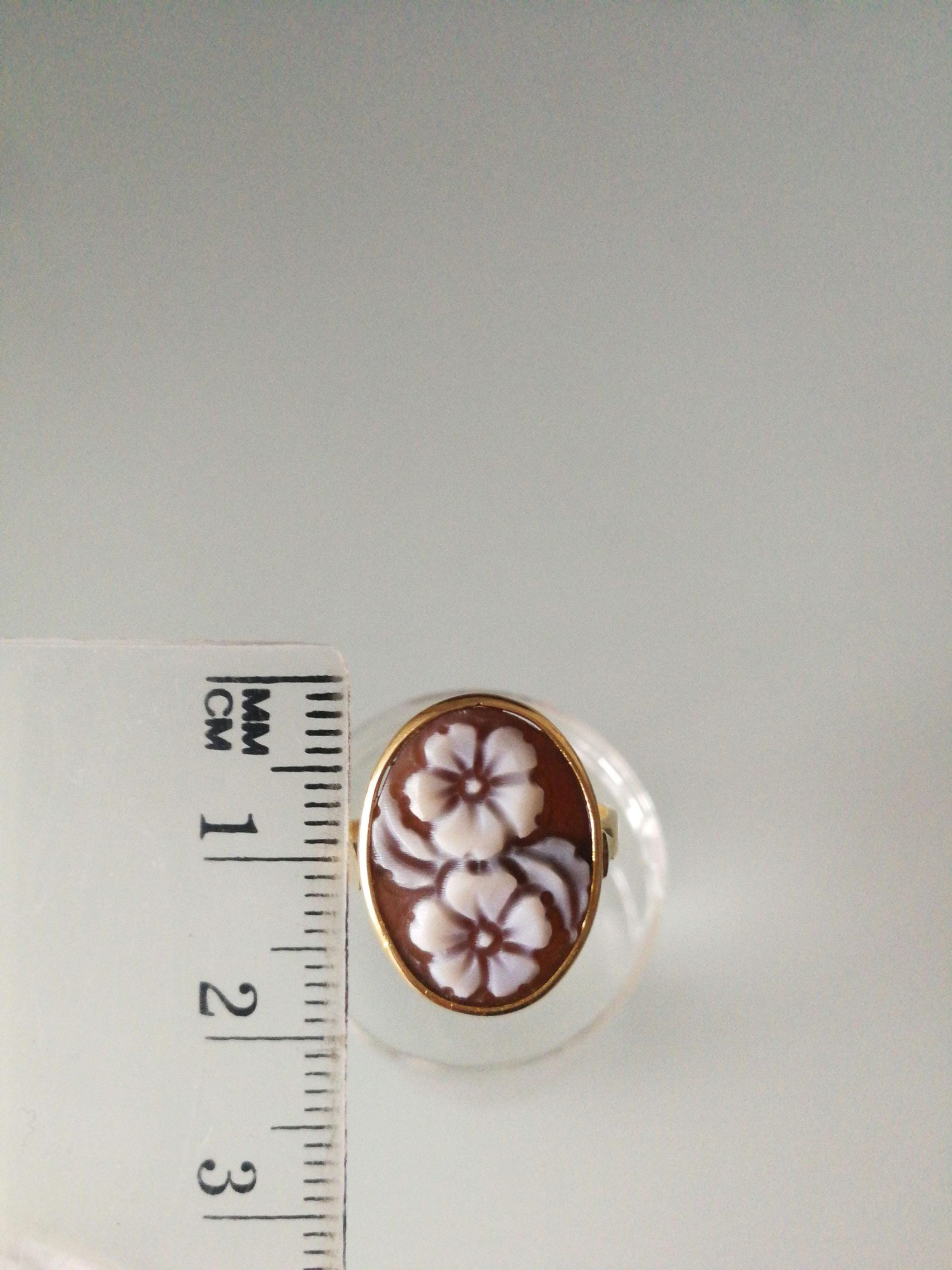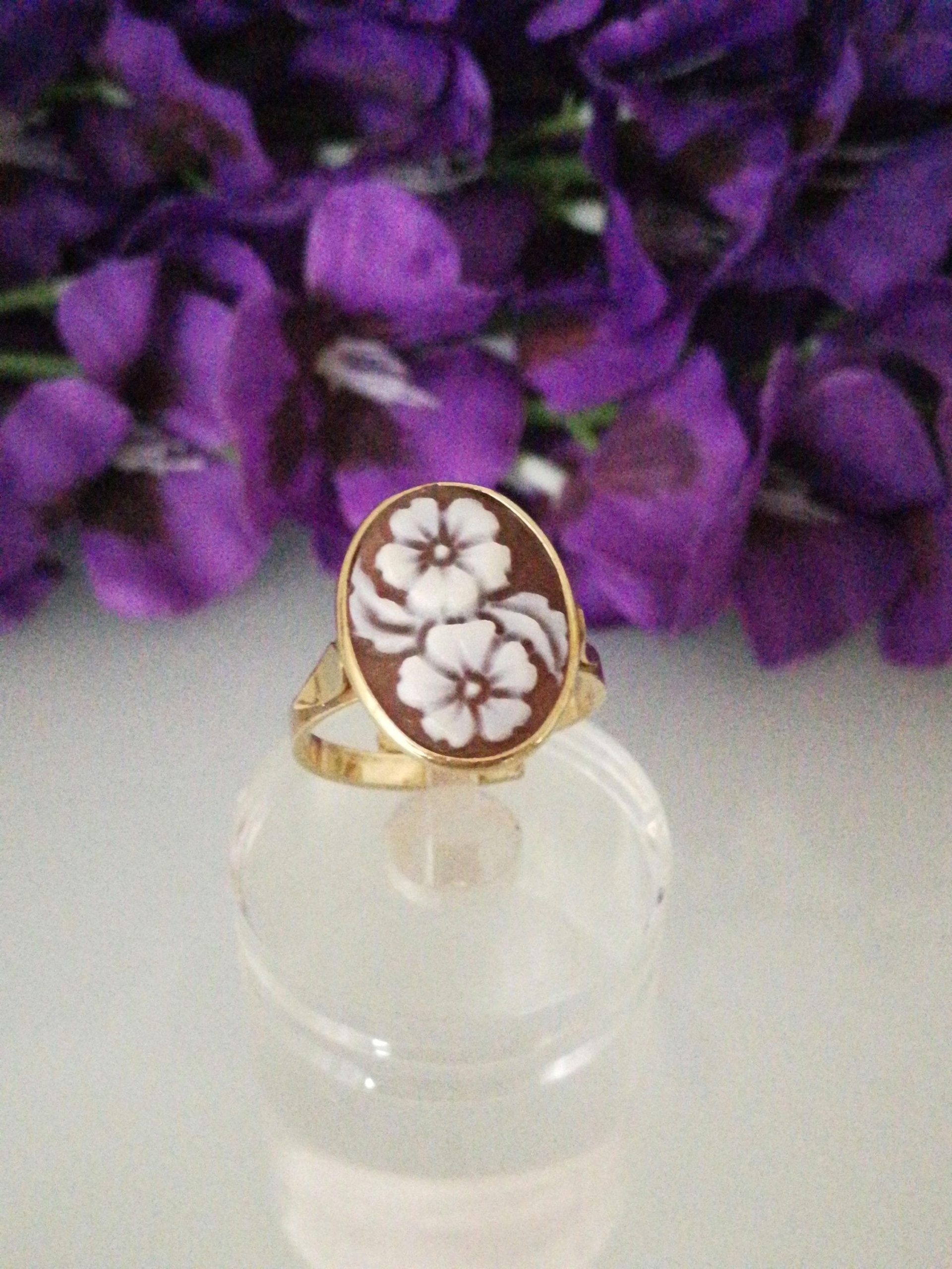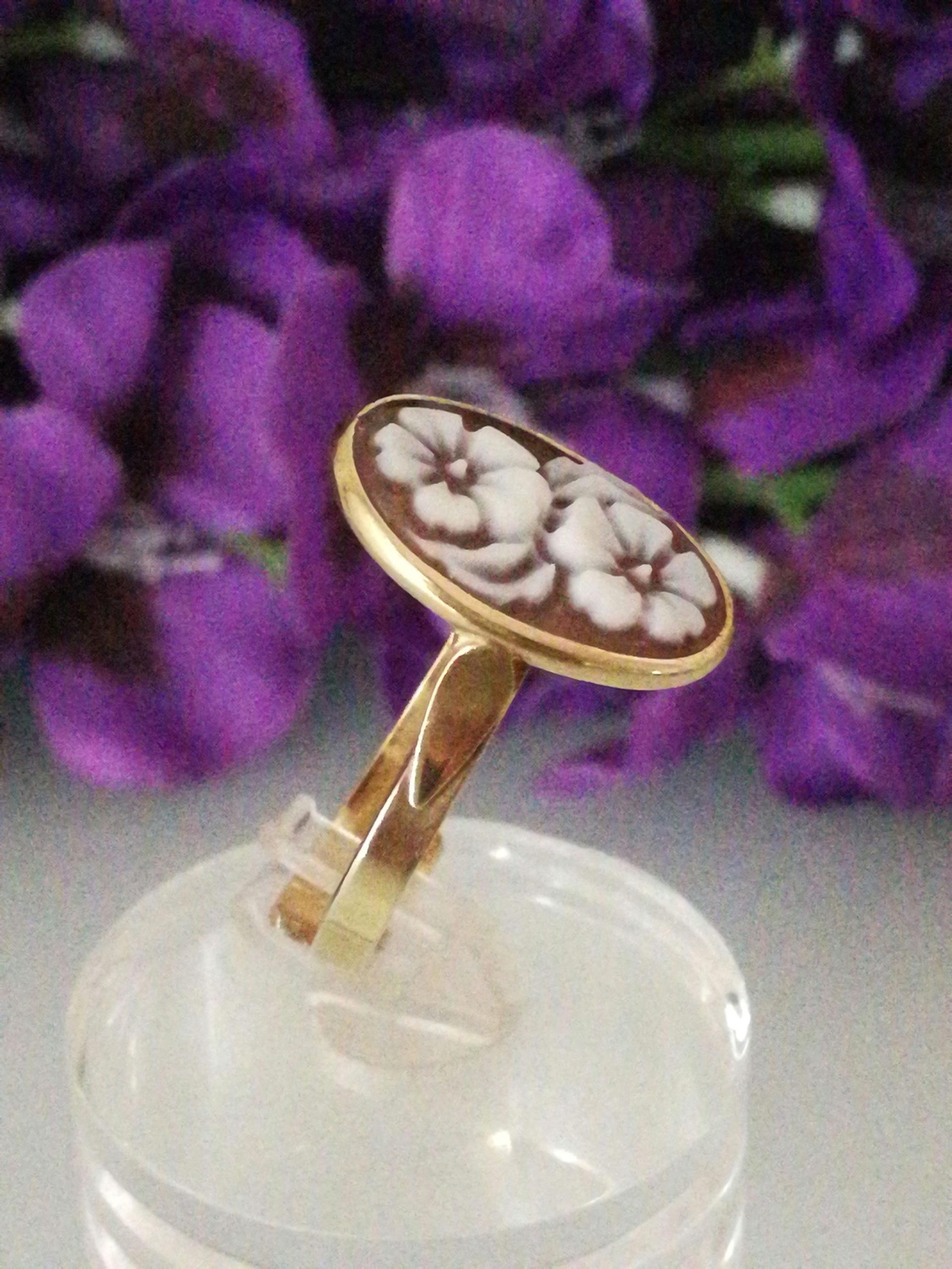 Anello stile art noveau, con cammeo ,che raffigura fiori , con montatura in argento placcata oro a lavorazione artigianale Misura del cammeo lunghezza 2 cm. Misura anello regolabile.