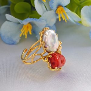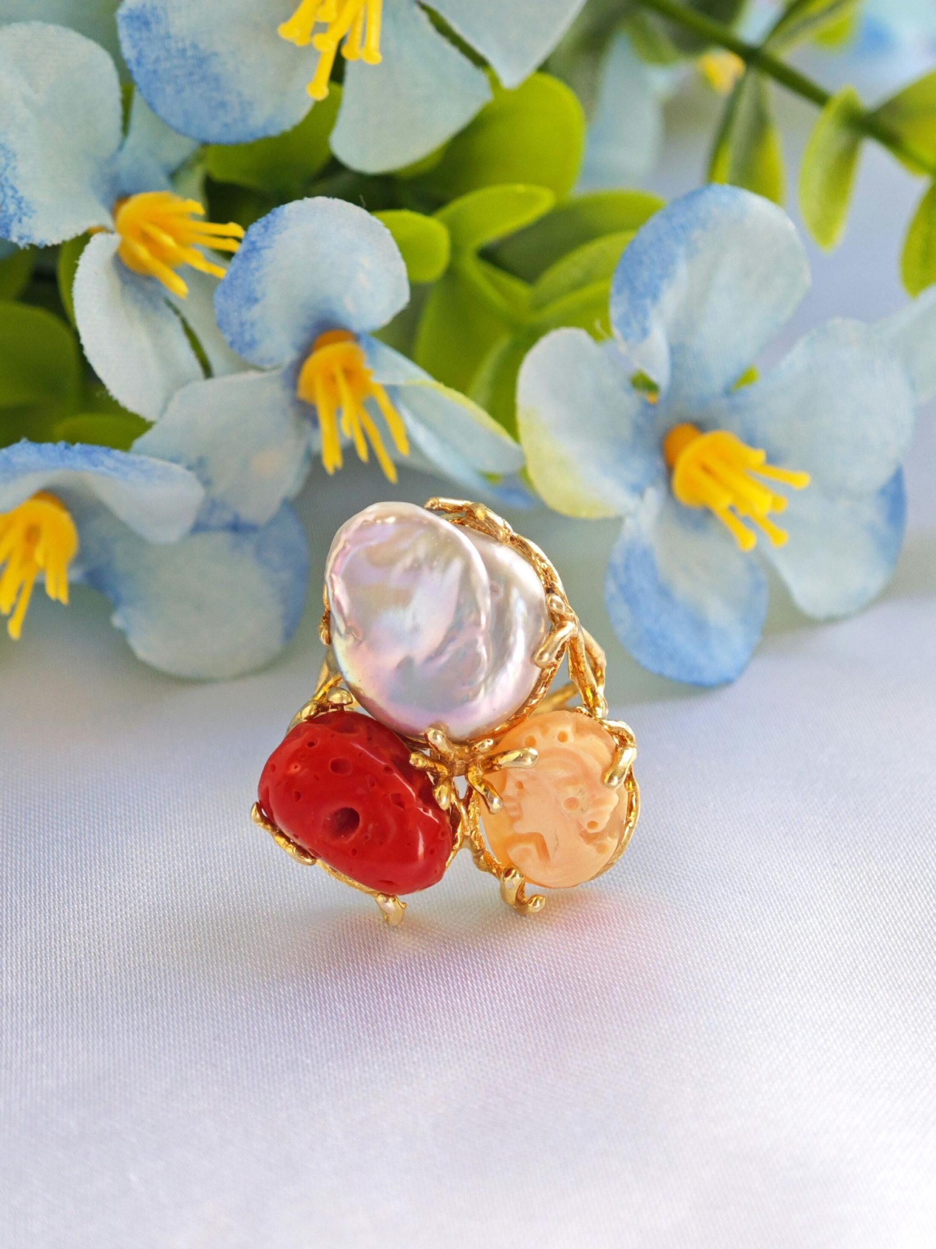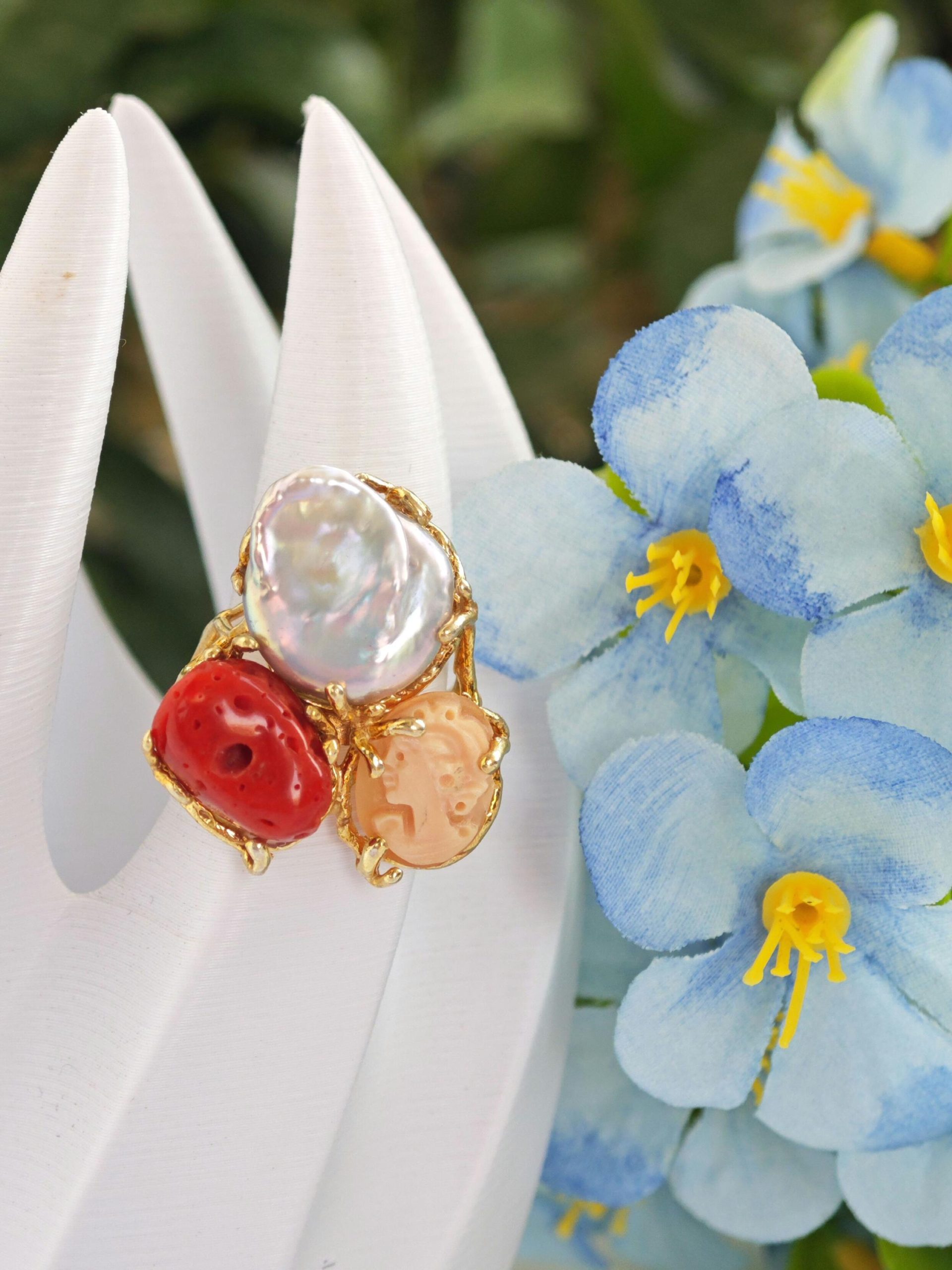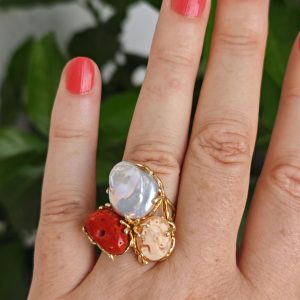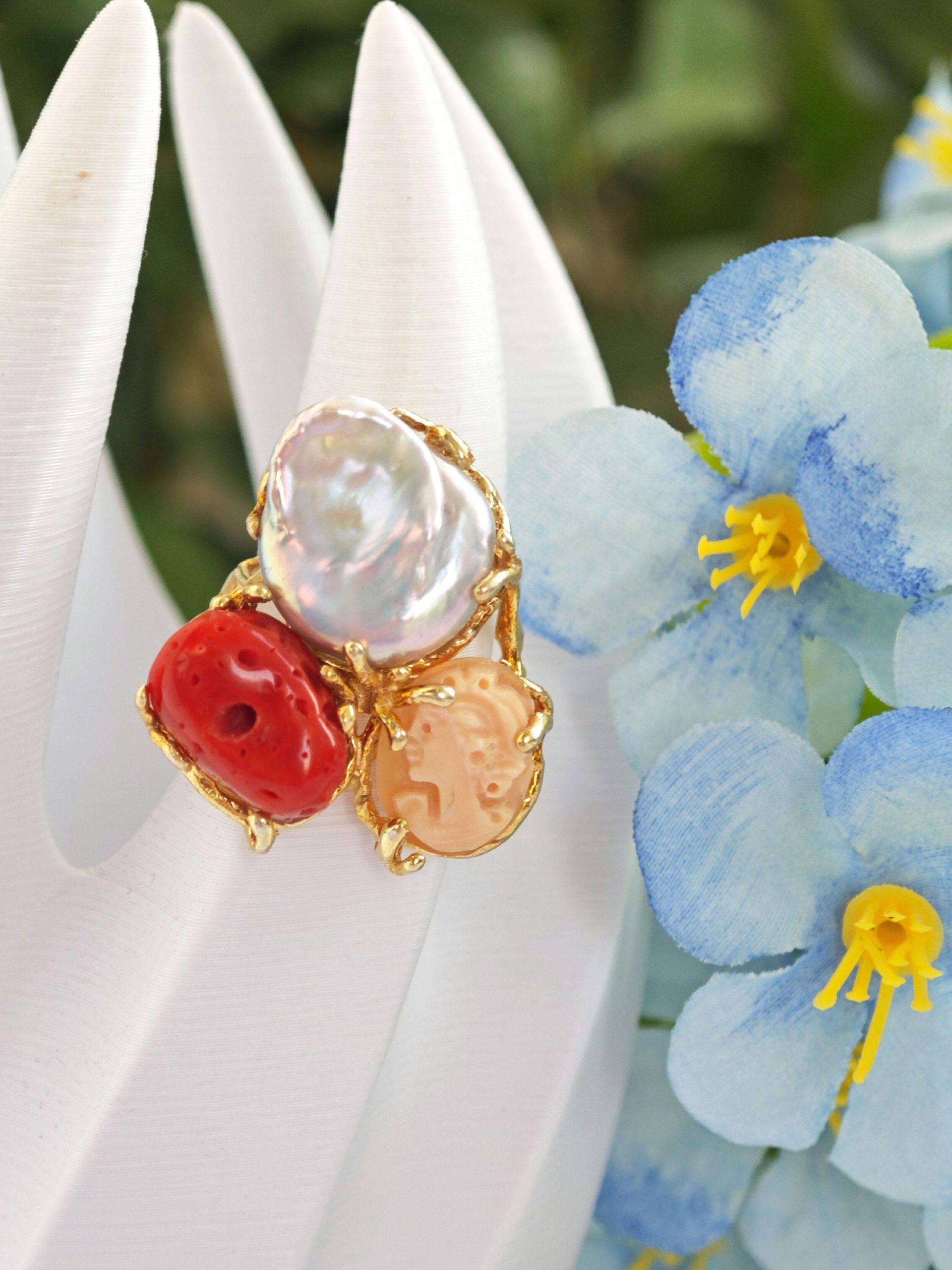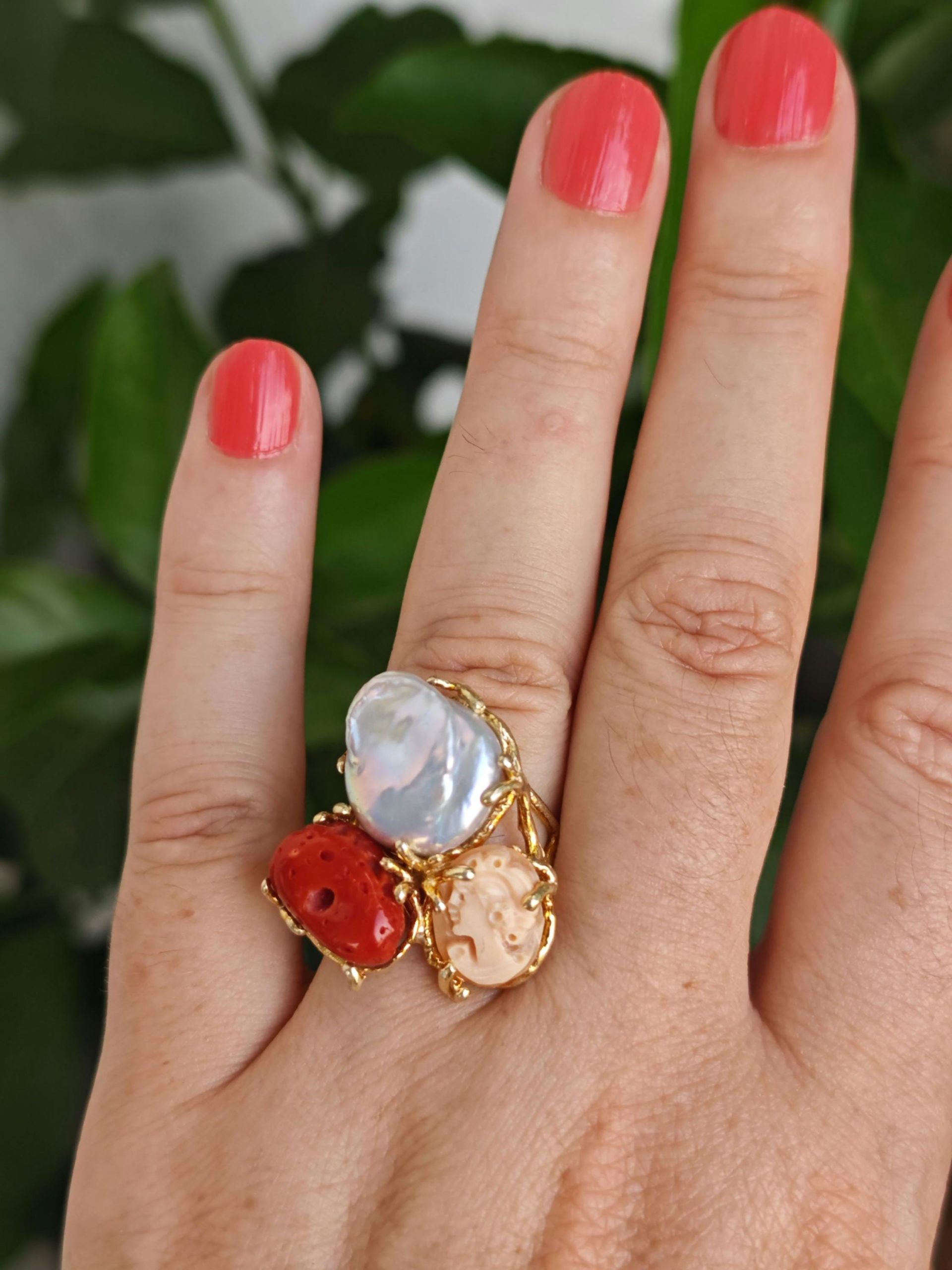 Anello cammeo conchiglia sardonica , corallo rosso e perla barocca bianca , anello argento 925 placcato oro , gioielli italiani