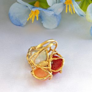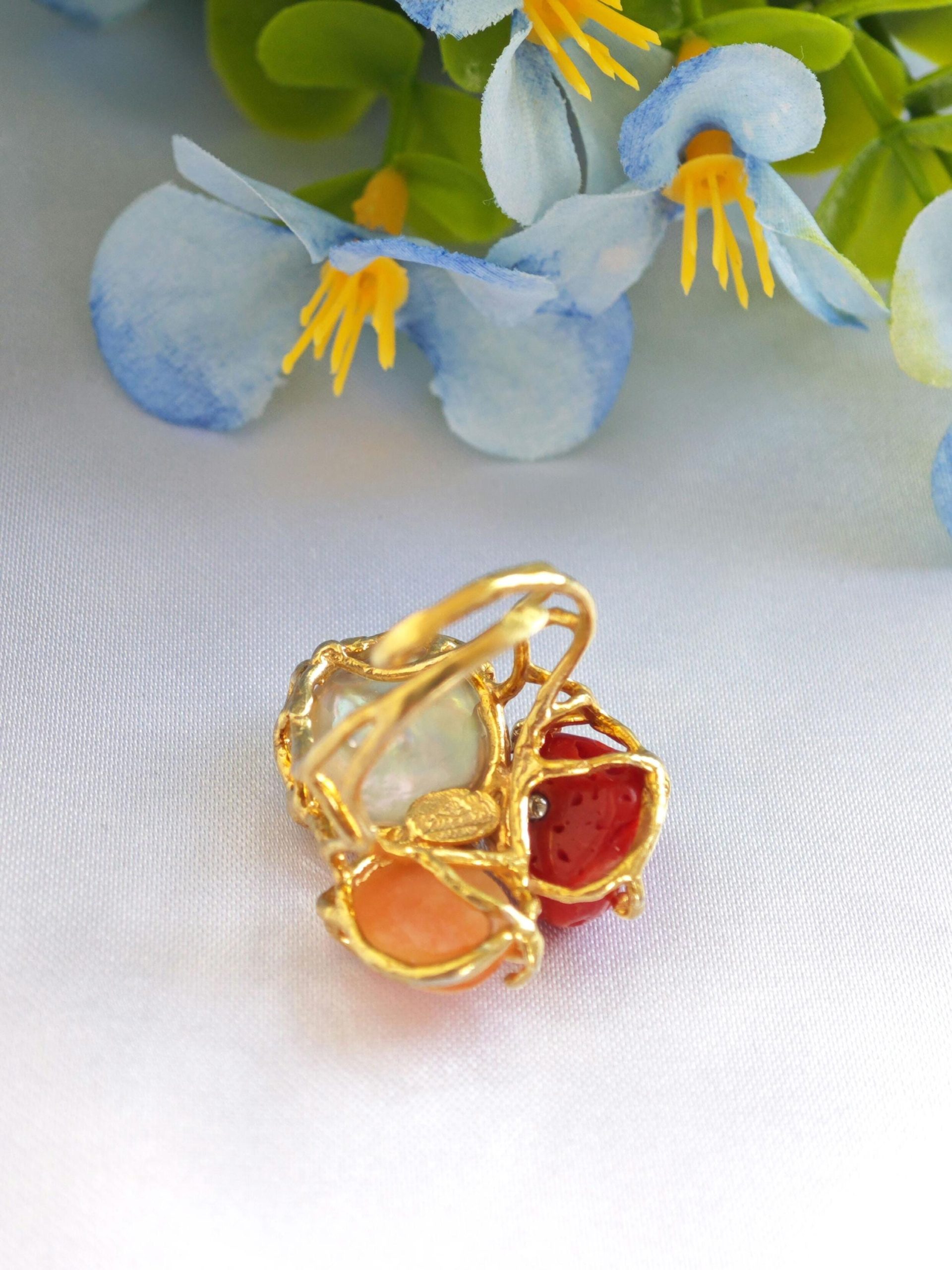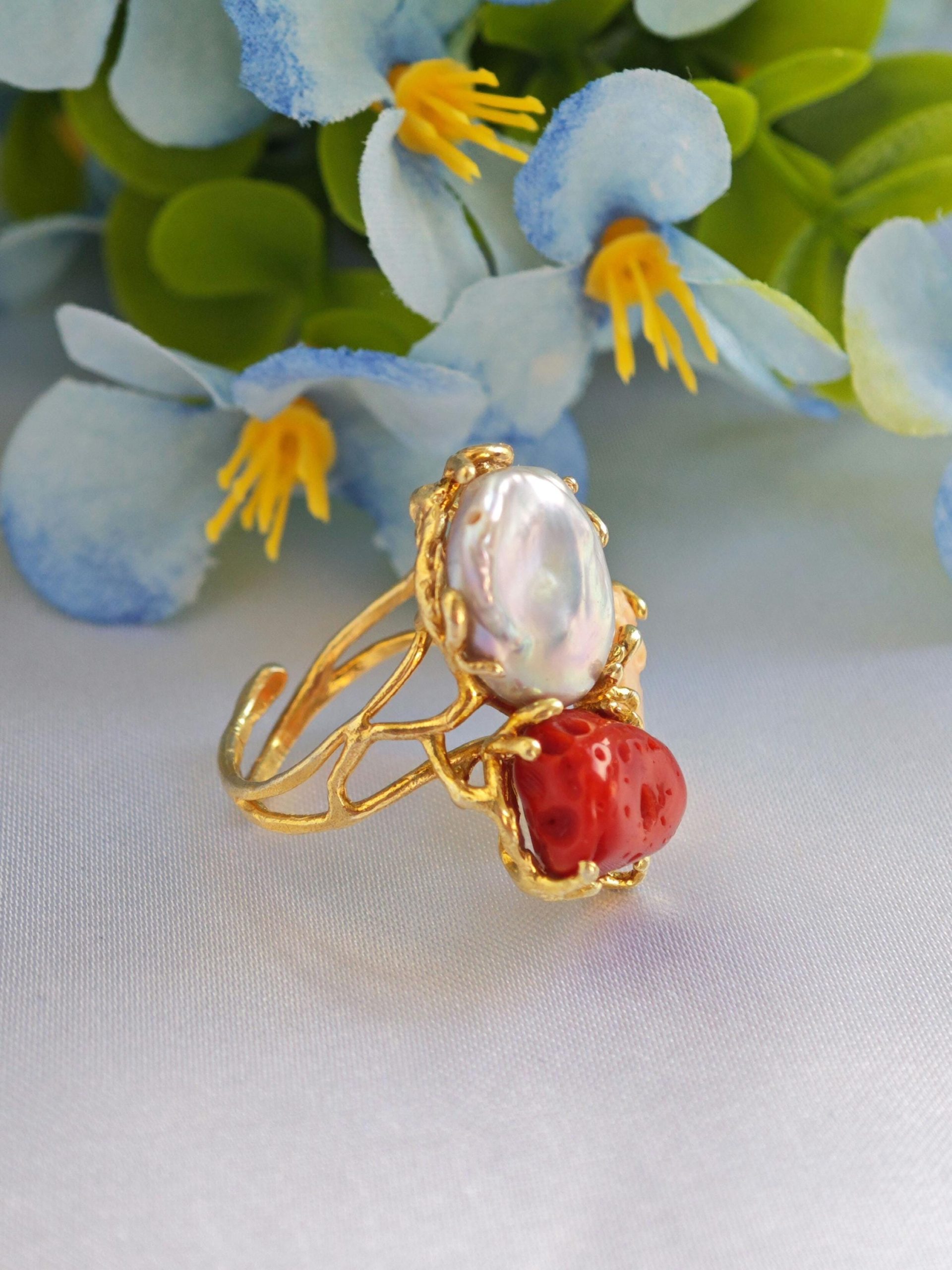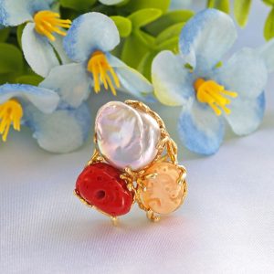 Anello .maxi corallo rosa, corallo rosso e perle bianche , anello argento 925, gioielli italiani