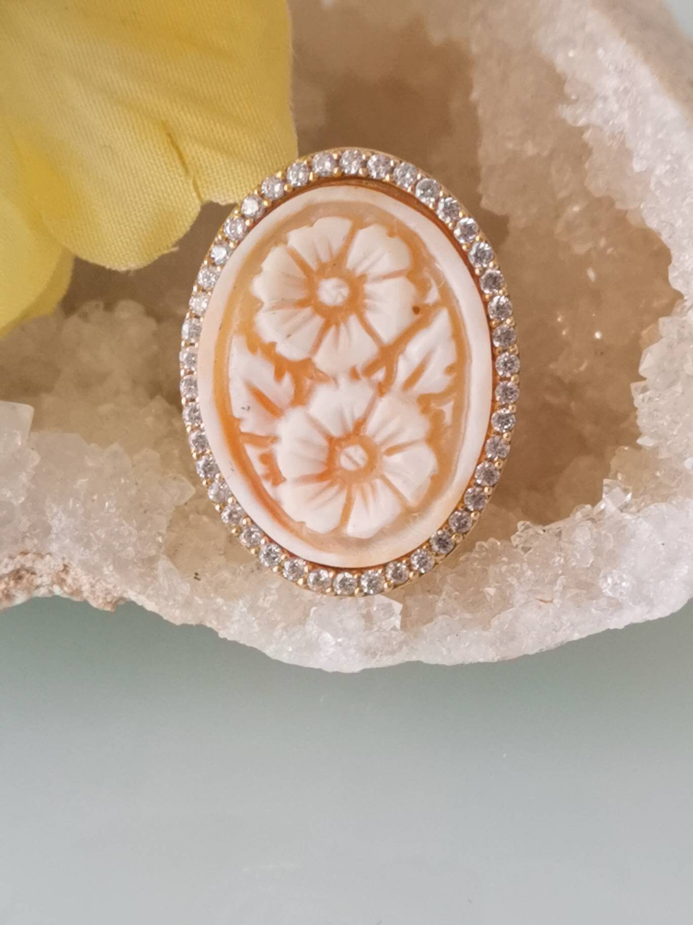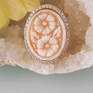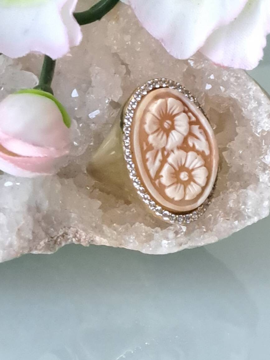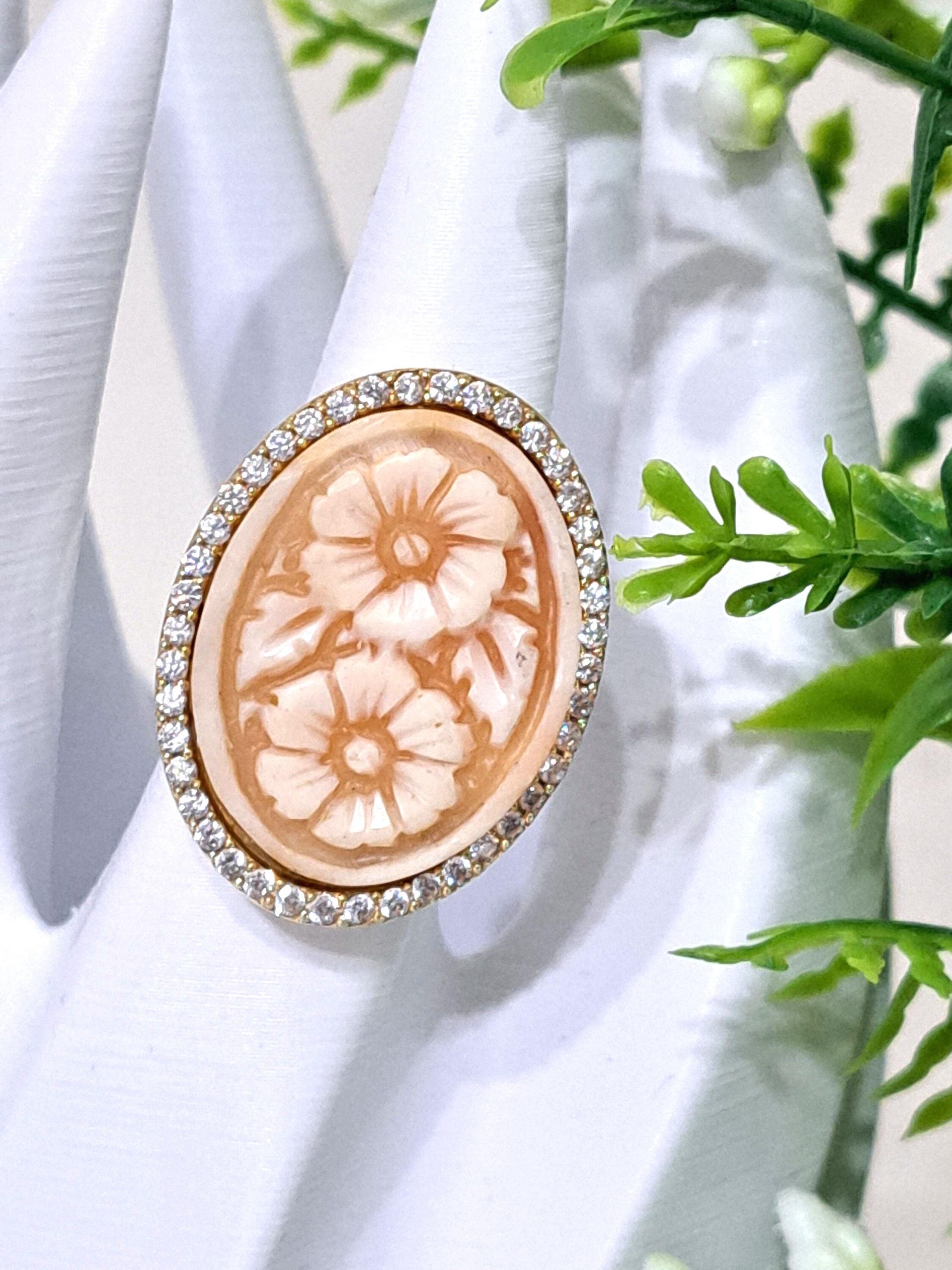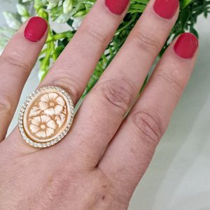 Anello artigianale maxi in argento 925 placcato oro con cornice zirconi con cammeo autentico realizzato a mano in conchiglia sardonica a Torre del greco raffigurante fiori , 29×22 cm dimensioni