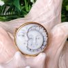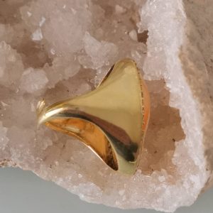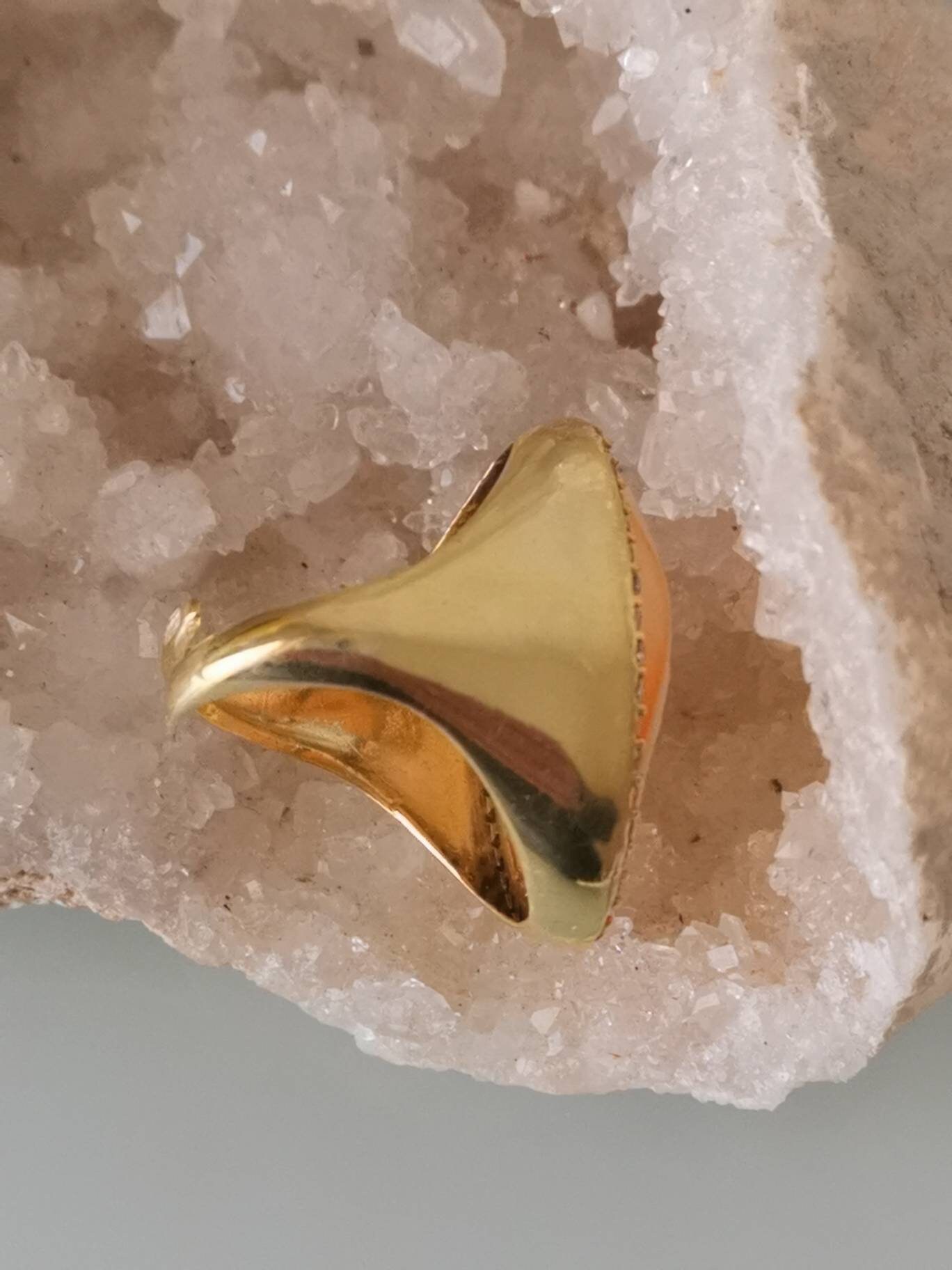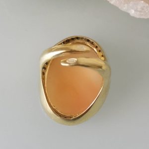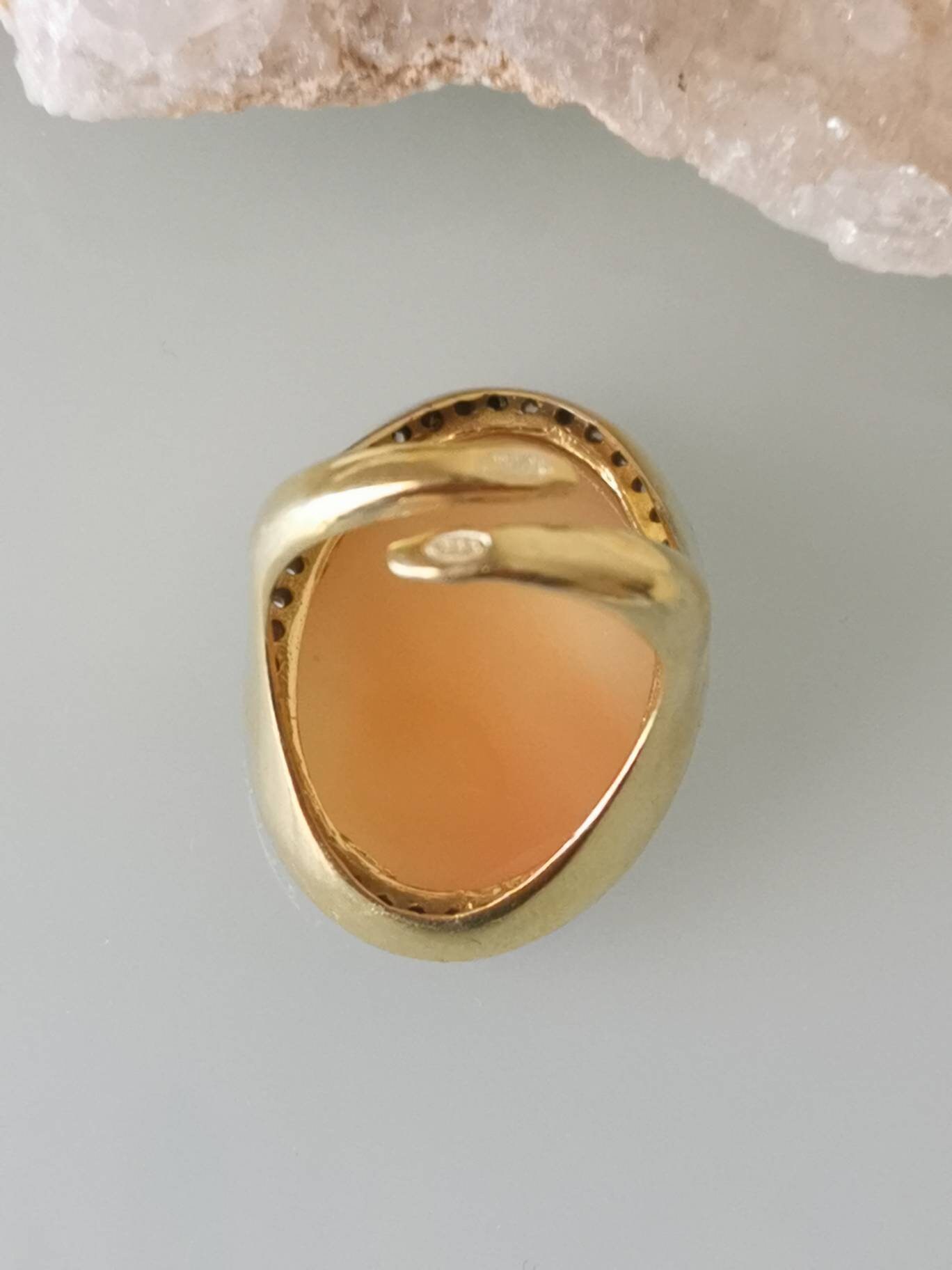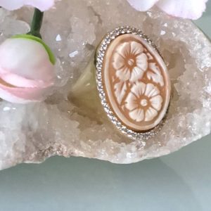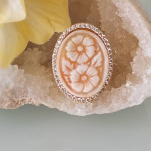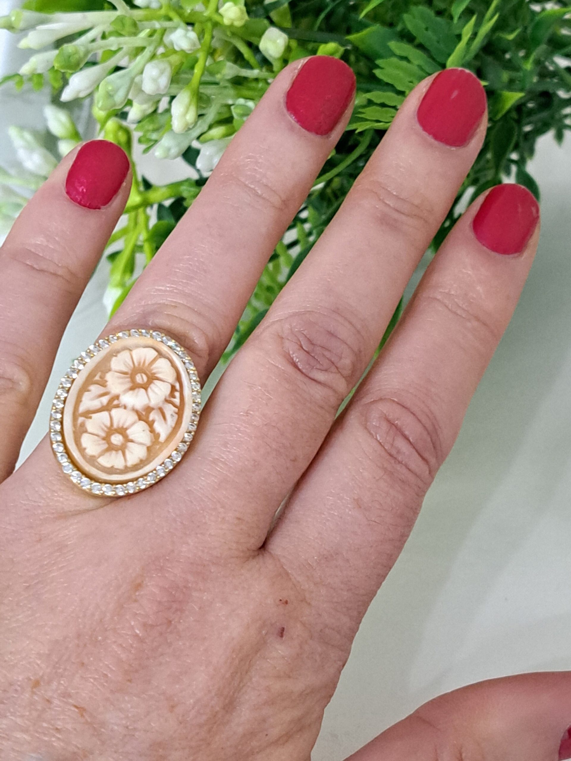 Anello artigianale maxi in argento 925 placcato oro con cornice zirconi con cammeo autentico realizzato a mano in conchiglia sardonica a Torre del greco raffigurante fiori , 29×22 cm dimensioni