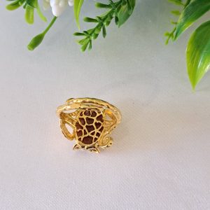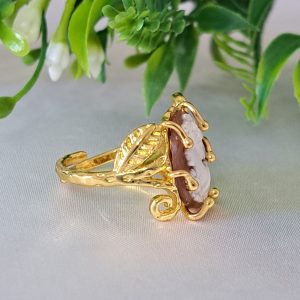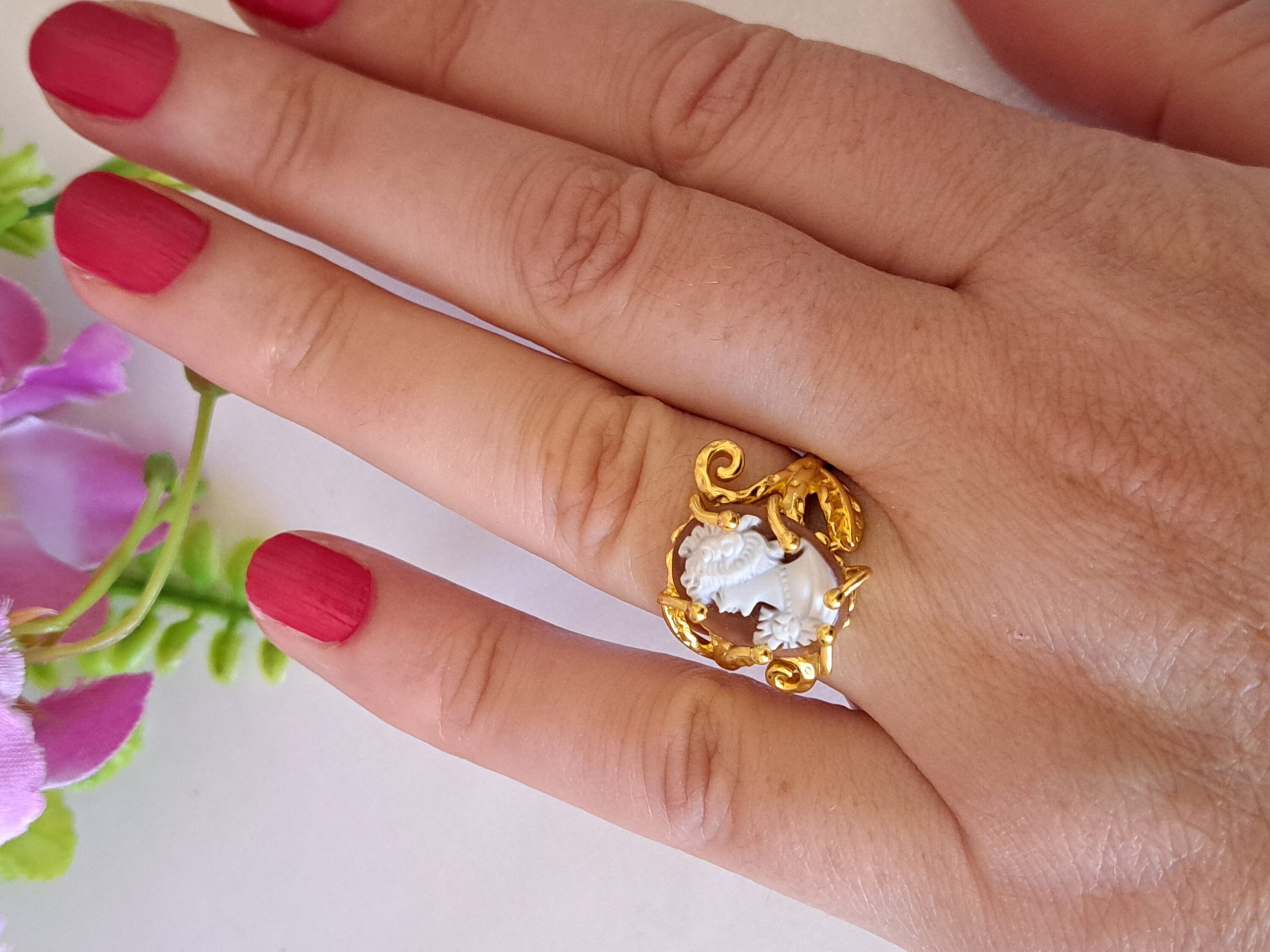 Anello artigianale in ottone dorato con cammeo conchiglia sardonica realizzato a mano a Torre del greco raffigurante volto di donna 1,5×1,2 cm dimensioni .