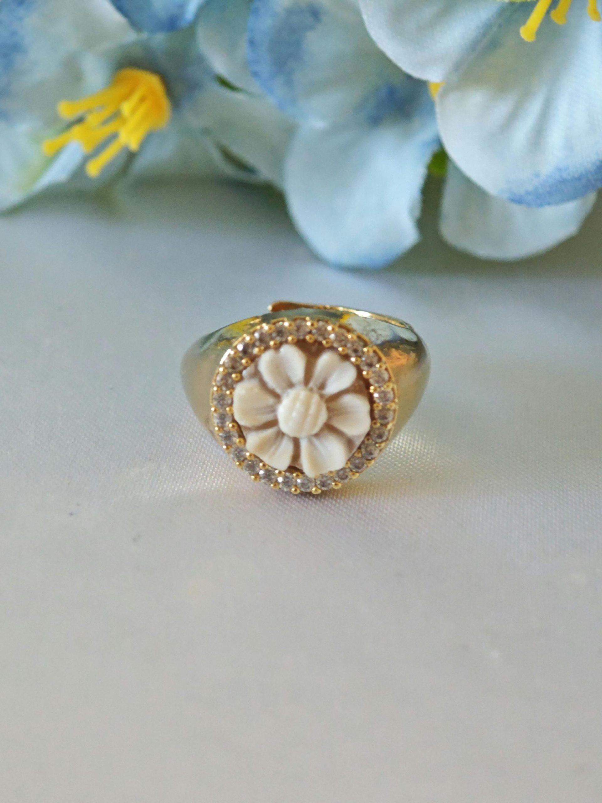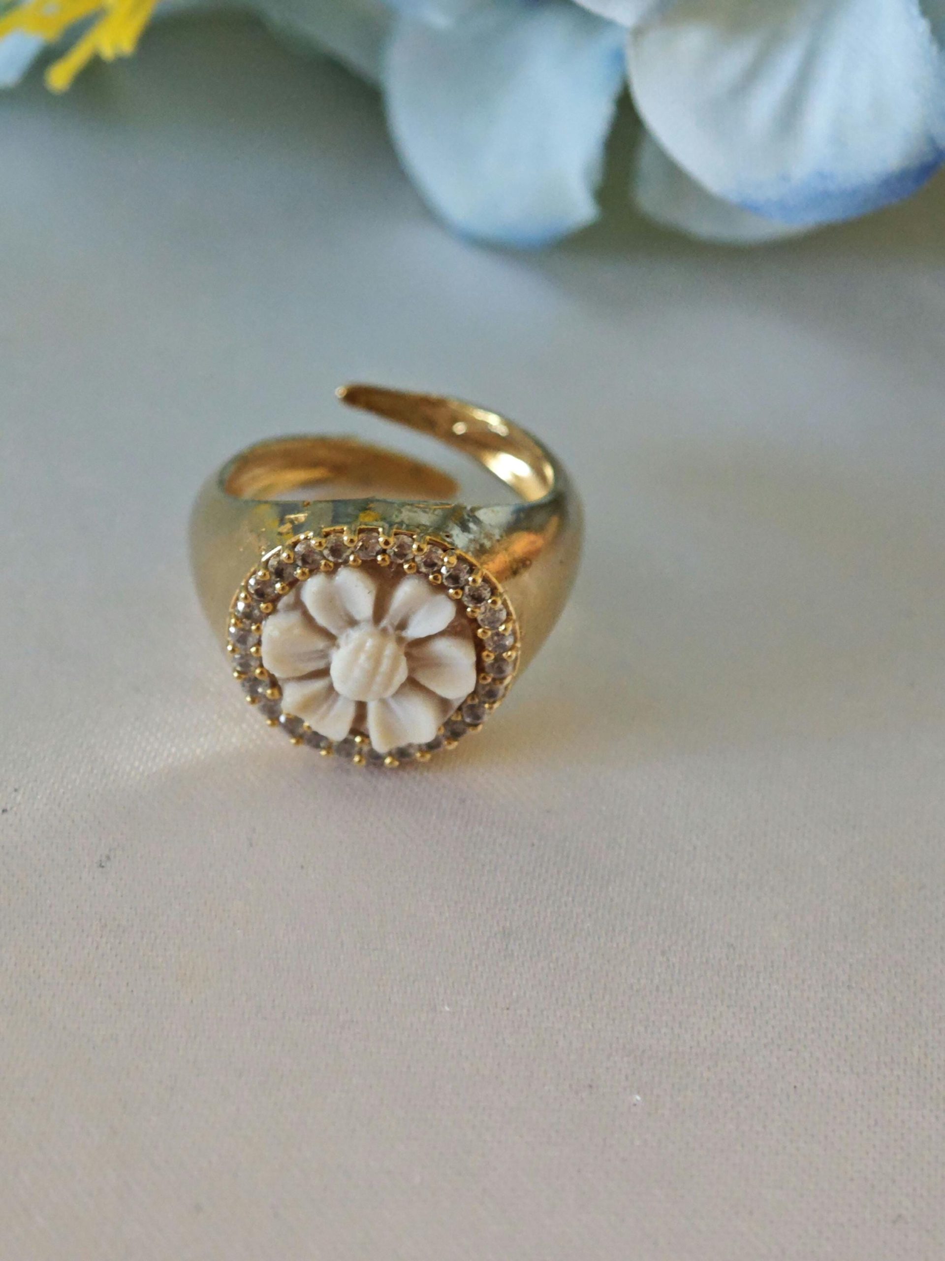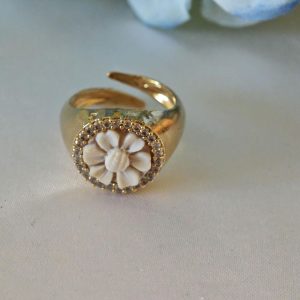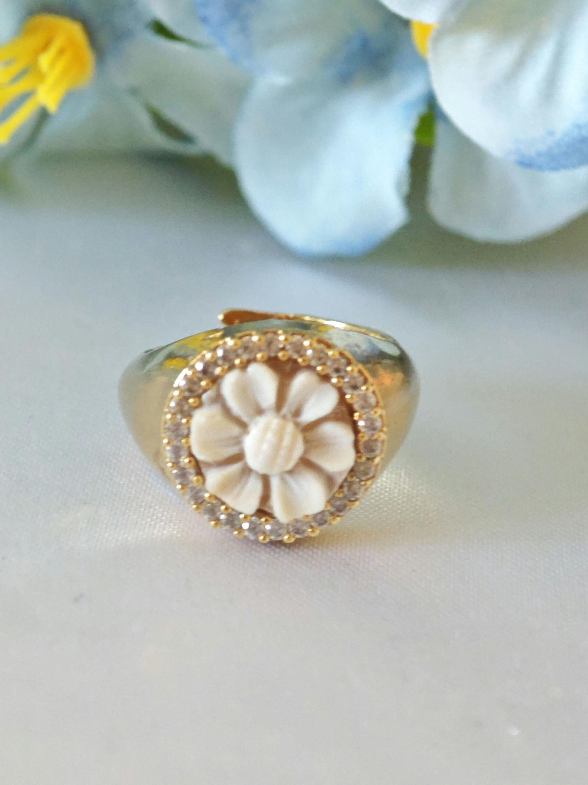 Anello con base in ottone dorato con cornice zirconi e con cammeo autentico in conchiglia sardonica scolpito a mano a Torre del greco raffigurante fiore 11 mm diametro.