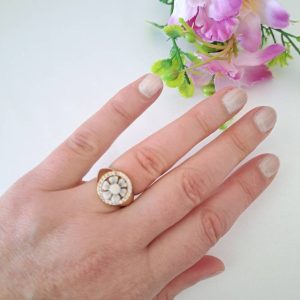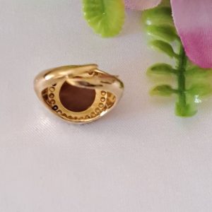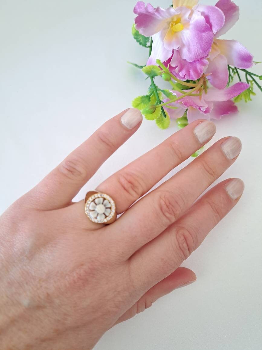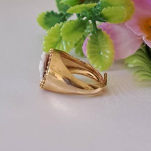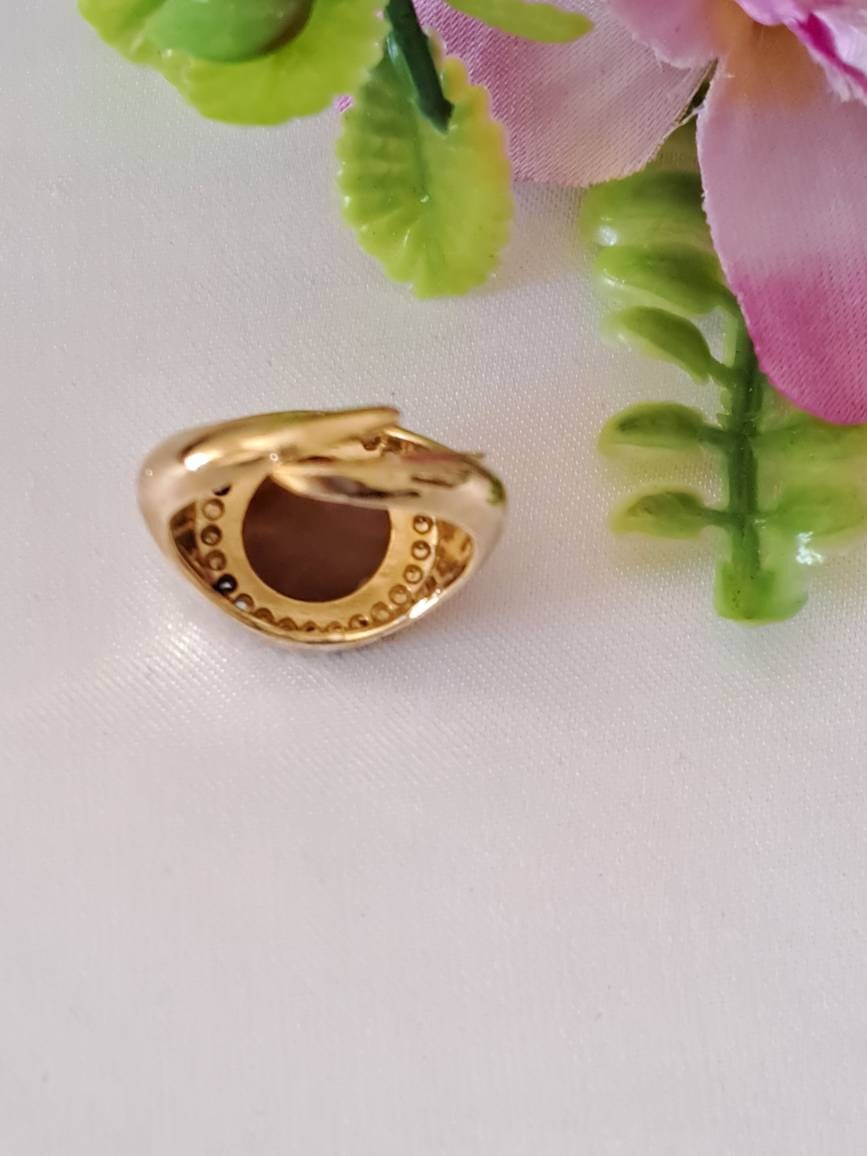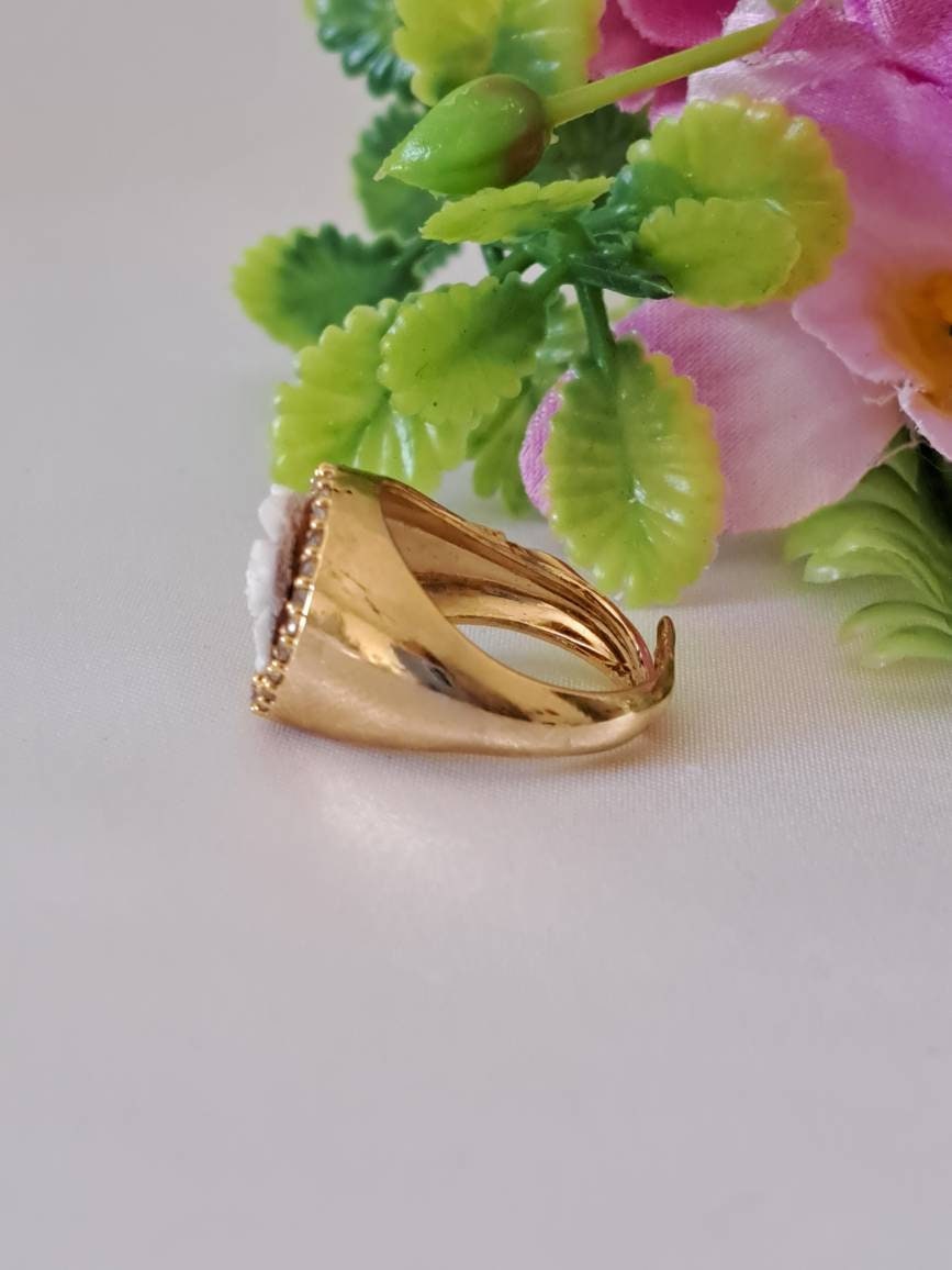 Anello con base in ottone dorato con cornice zirconi e con cammeo autentico in conchiglia sardonica scolpito a mano a Torre del greco raffigurante fiore 11 mm diametro.