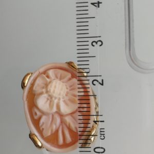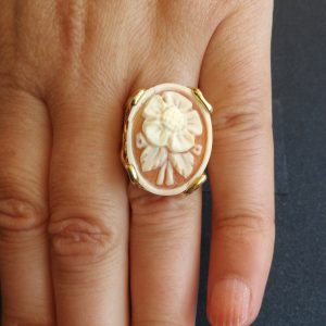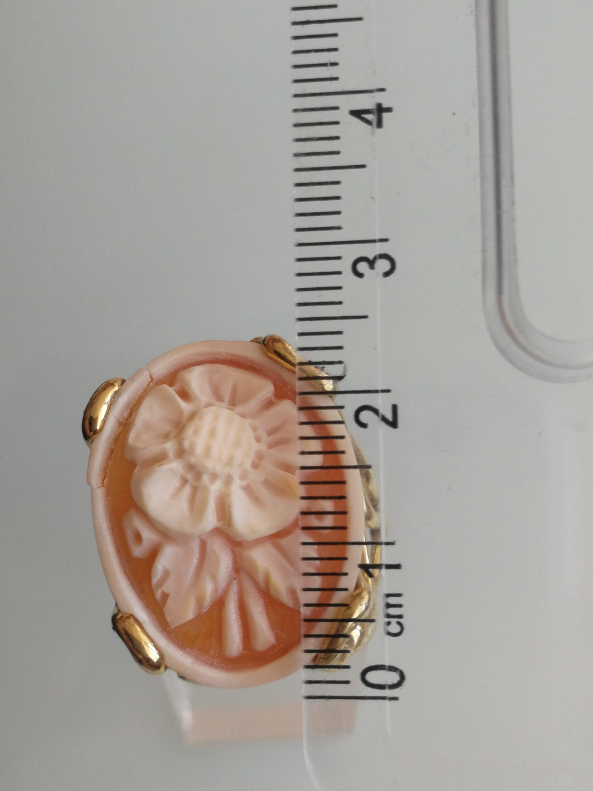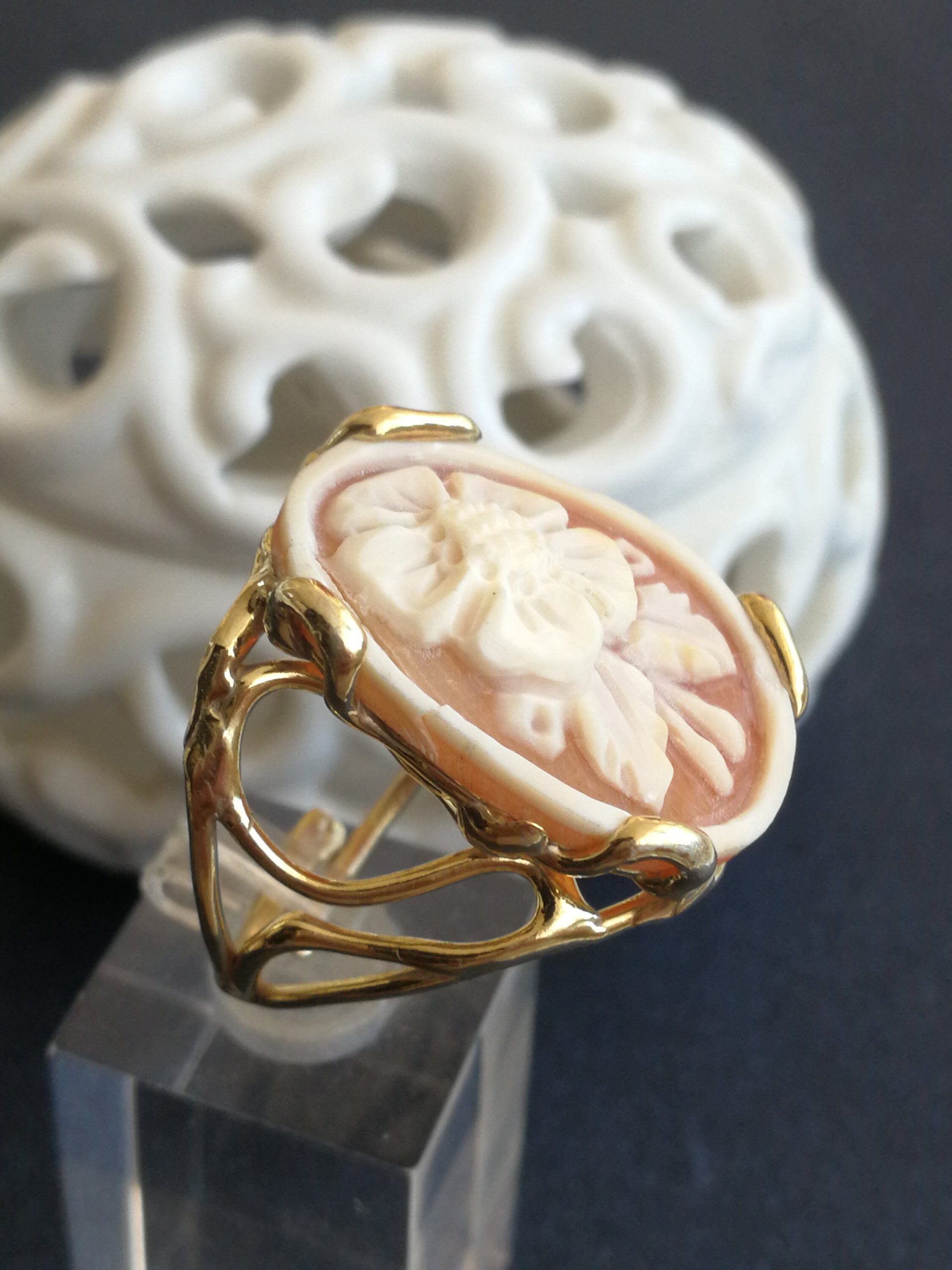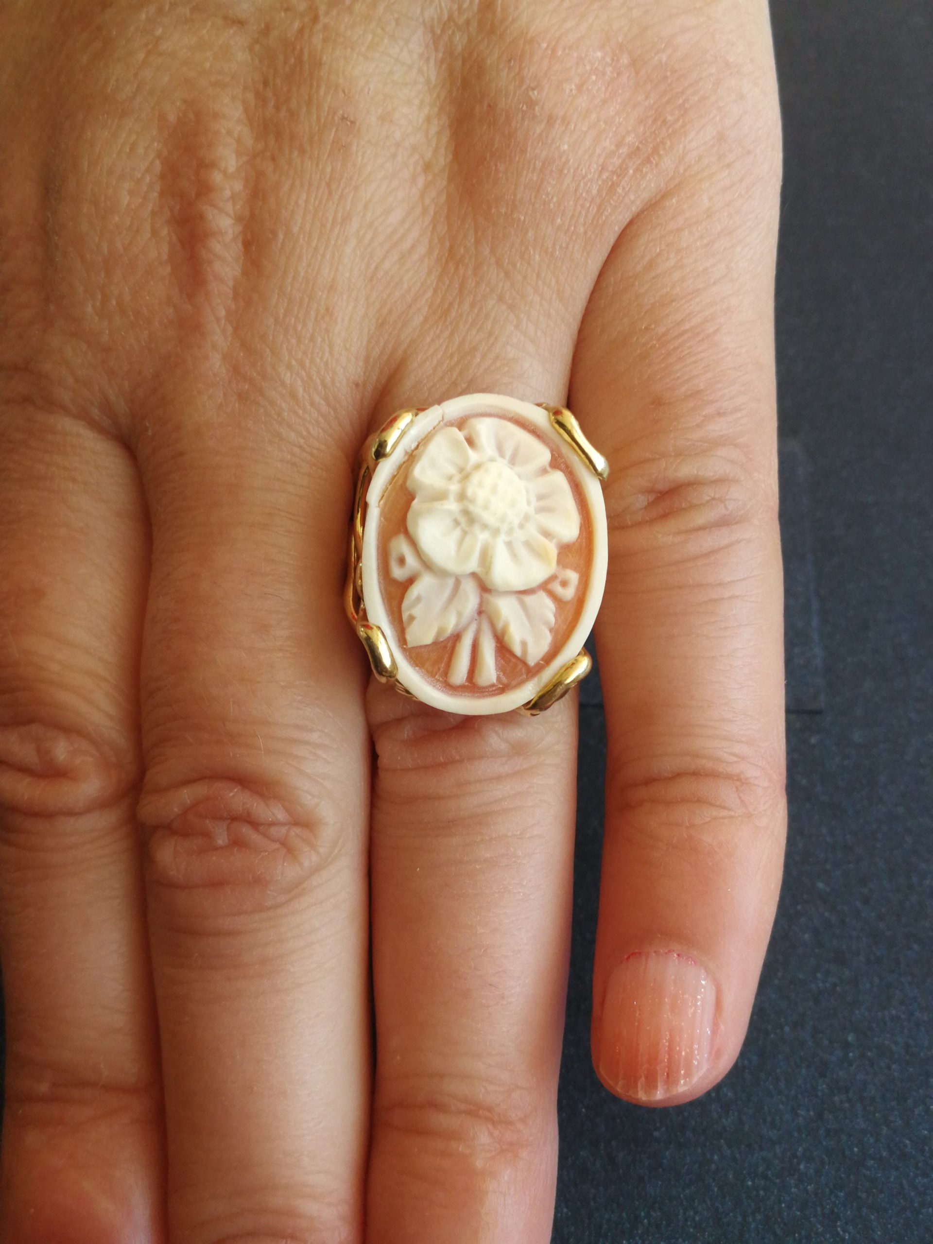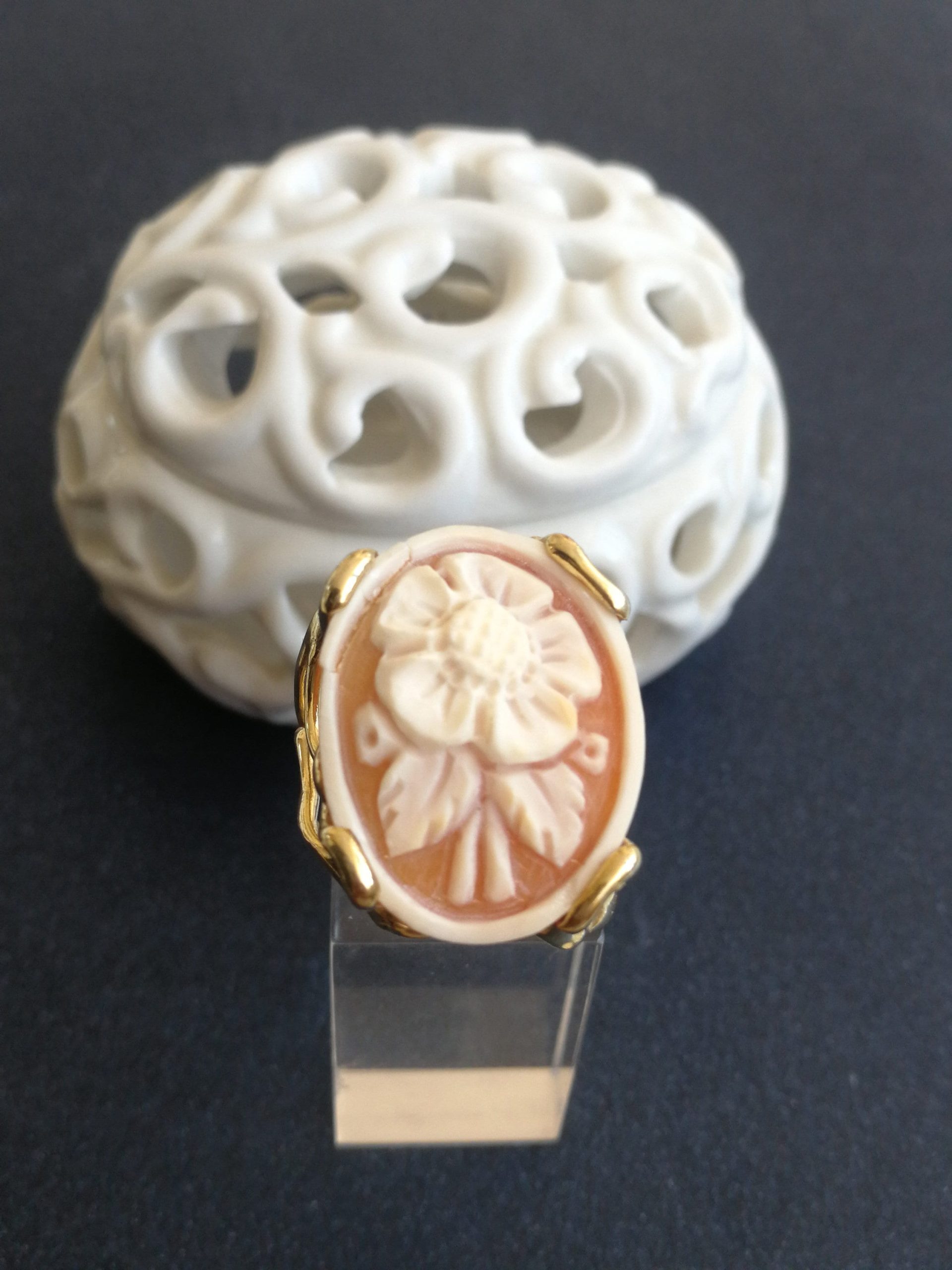 Anello bellissimo con cammeo conchiglia originale con fiore. Montatura in argento placcata oro, lavorazione a filo .Il cammeo è grande lunghezza cm 2,5/Larghezza cm 2.Misura anello regolabile.Con scatola regalo.Cammeo perfetto.