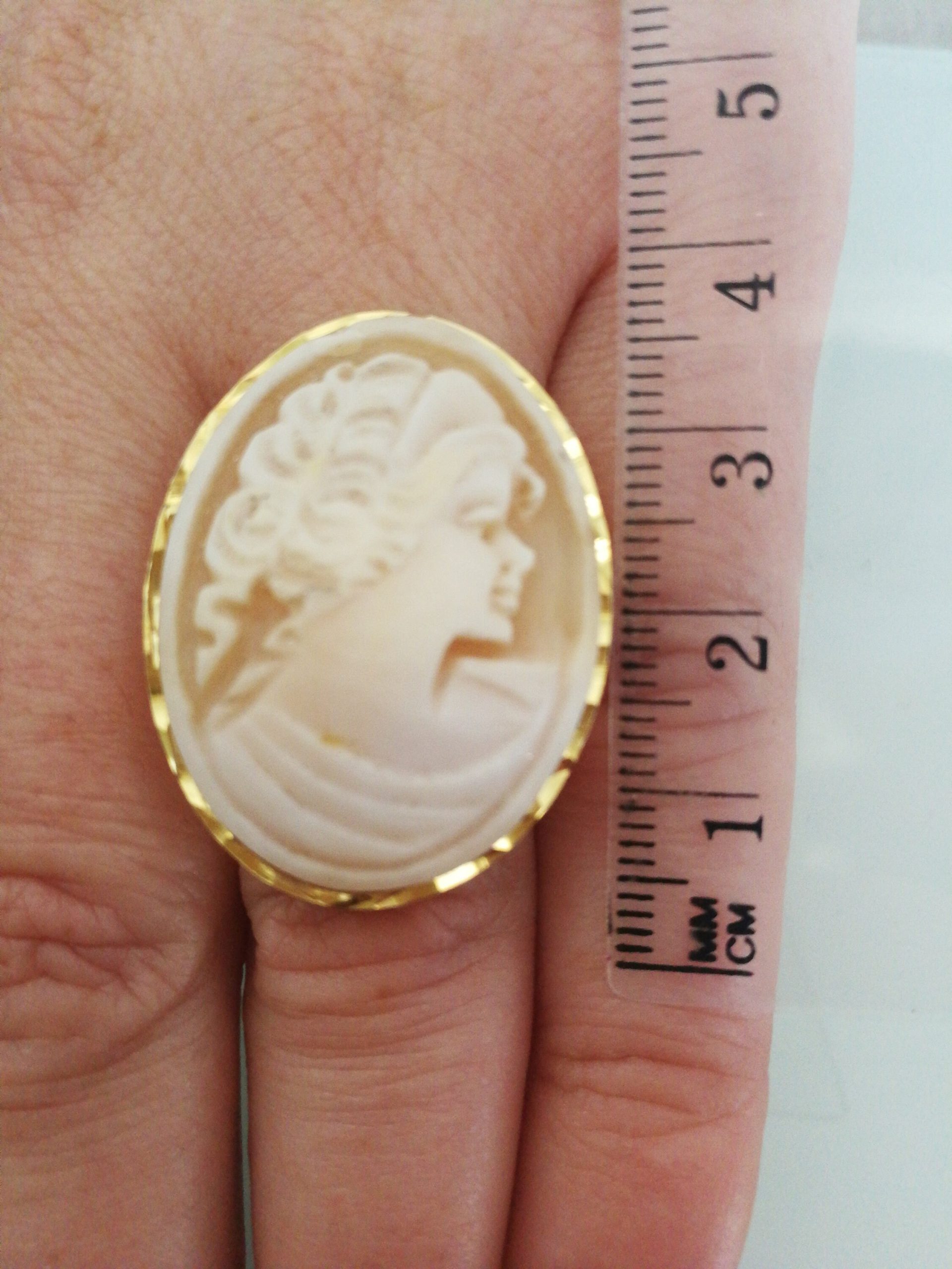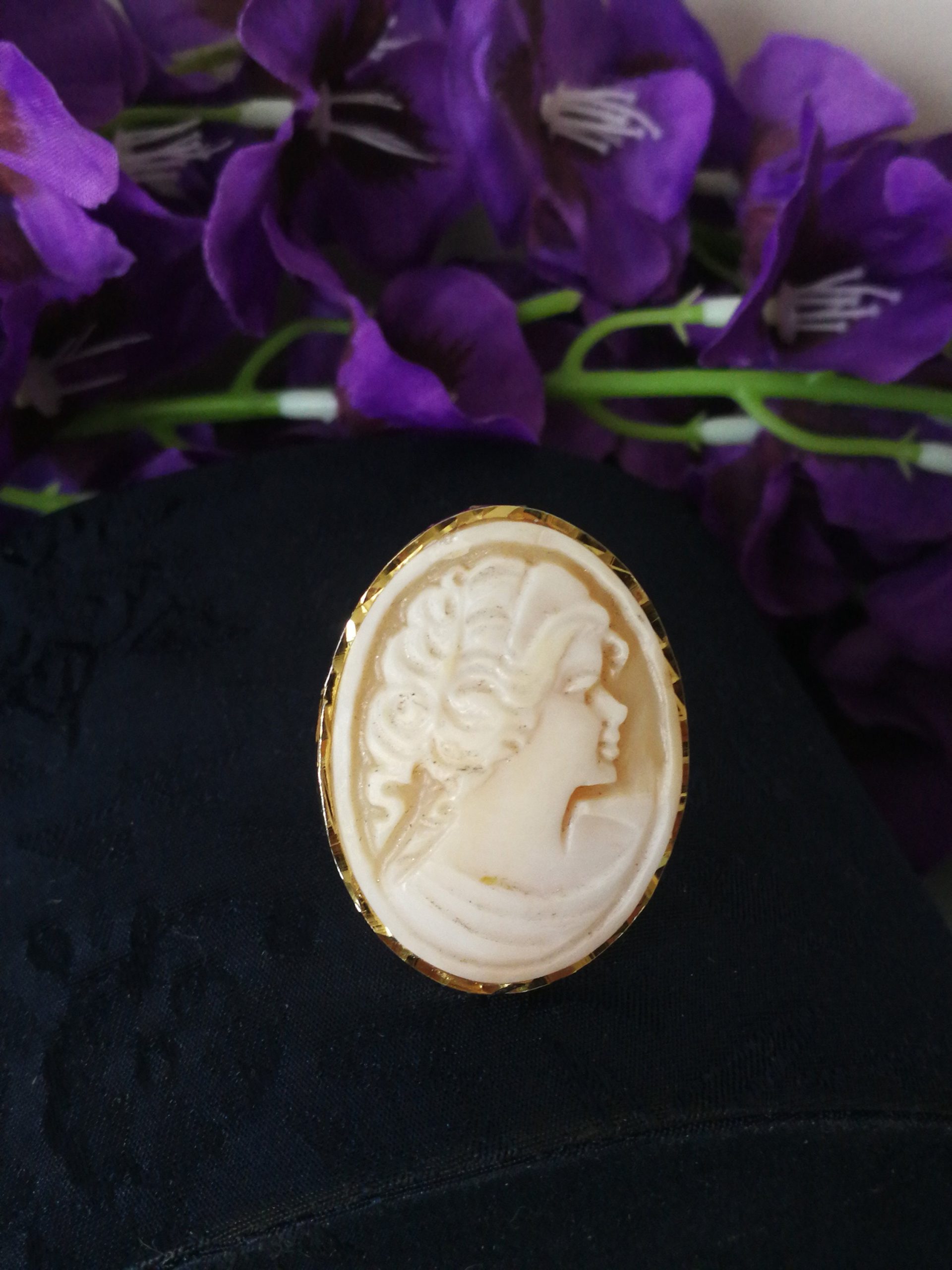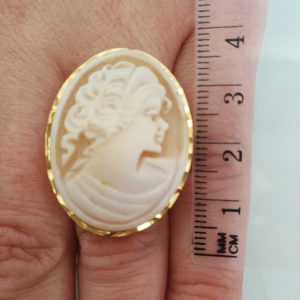 Anello bellissimo con cammeo conchiglia originale con volto di donna. Montatura in argento placcata oro, lavorazione scintillante .Il cammeo è grande lunghezza 3,5 cm /Larghezza cm 2,5.Misura anello regolabile.Con scatola regalo.Cammeo perfetto.