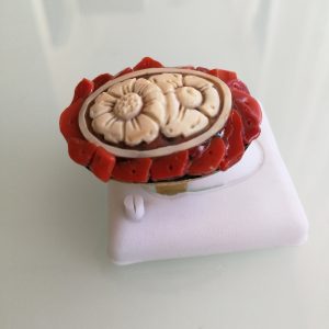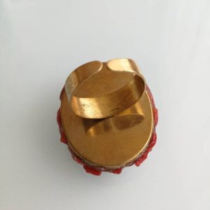Anello cammeo pasta di corallo rosso e ottone dorato, anello maxi, gioielli italiani