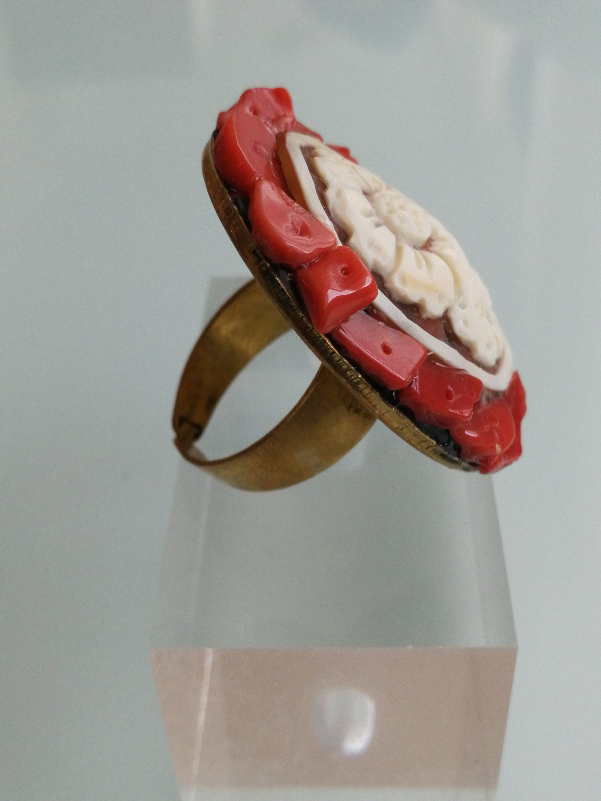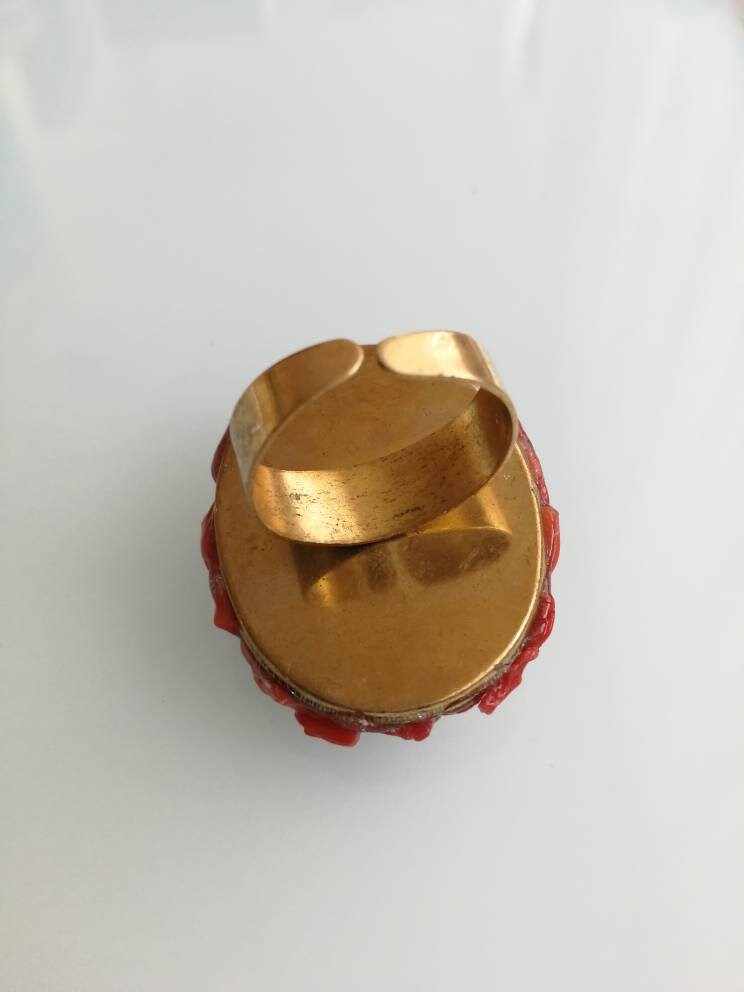 Anello cammeo  pasta di corallo rosso e ottone dorato, anello maxi, gioielli italiani