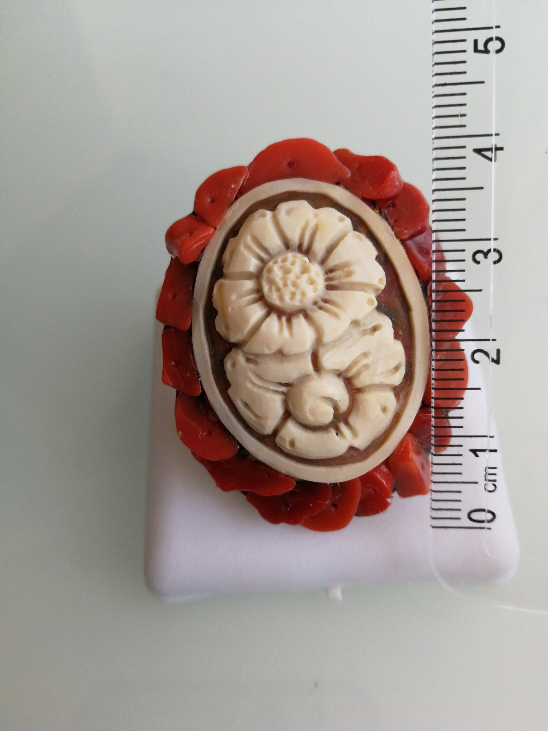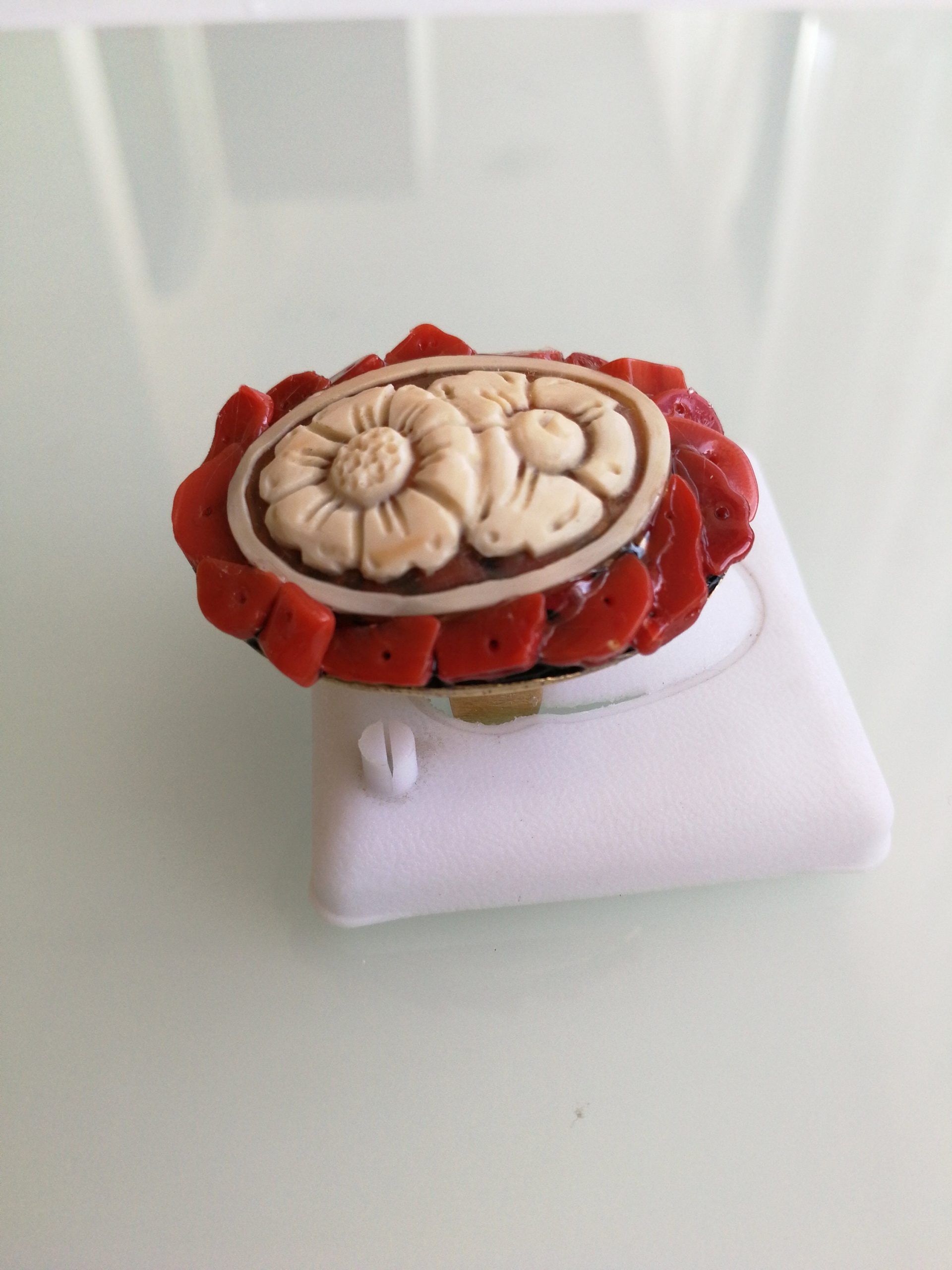Anello bellissimo antico, anni 1980, con cammeo conchiglia originale che raffigura fiori, contornato da corallo rosso naturale del mediterraneo , base in ottone . Diametro dell’anello 4 cm.Misura anello regolabile.Antique jewelry.