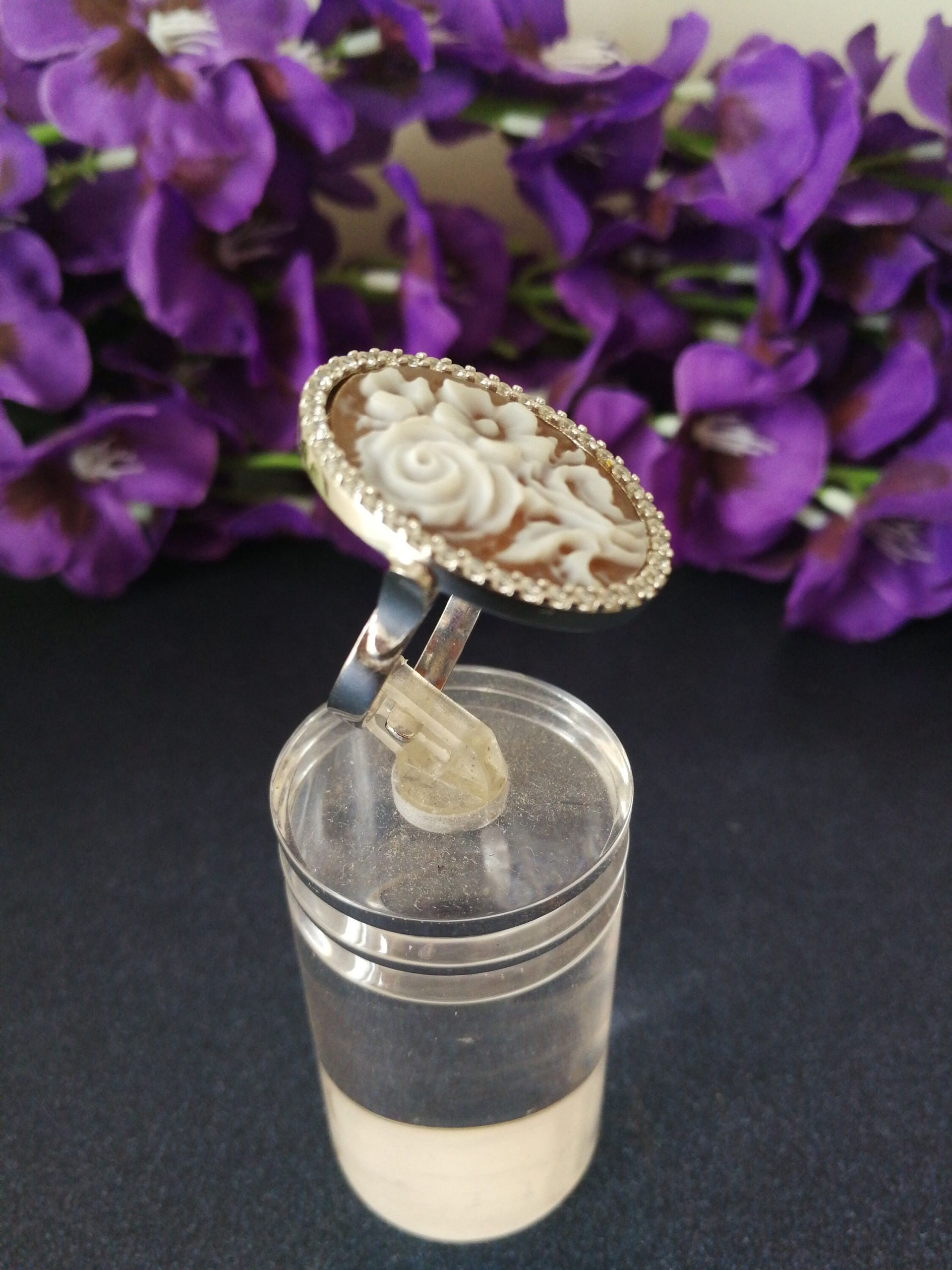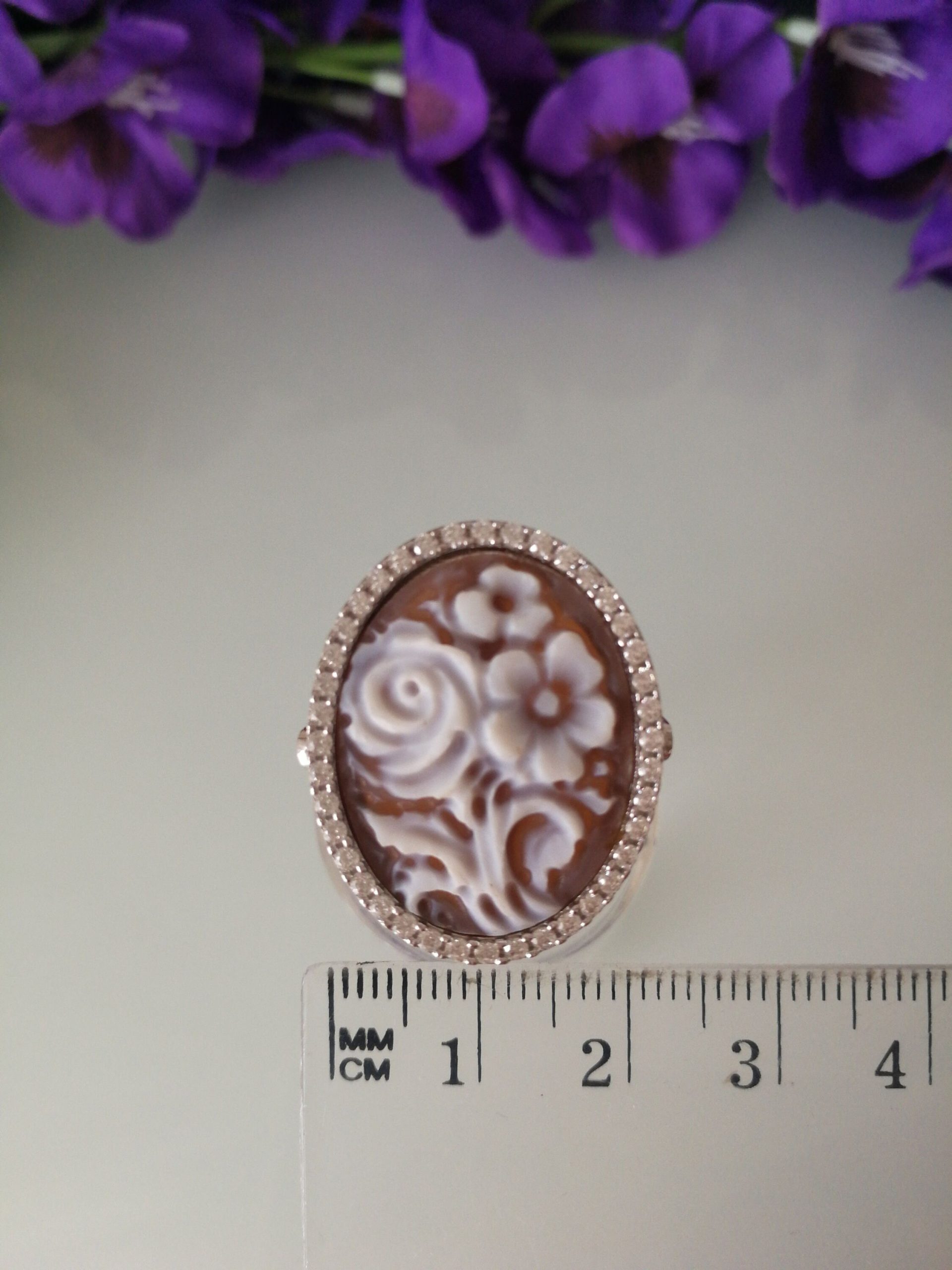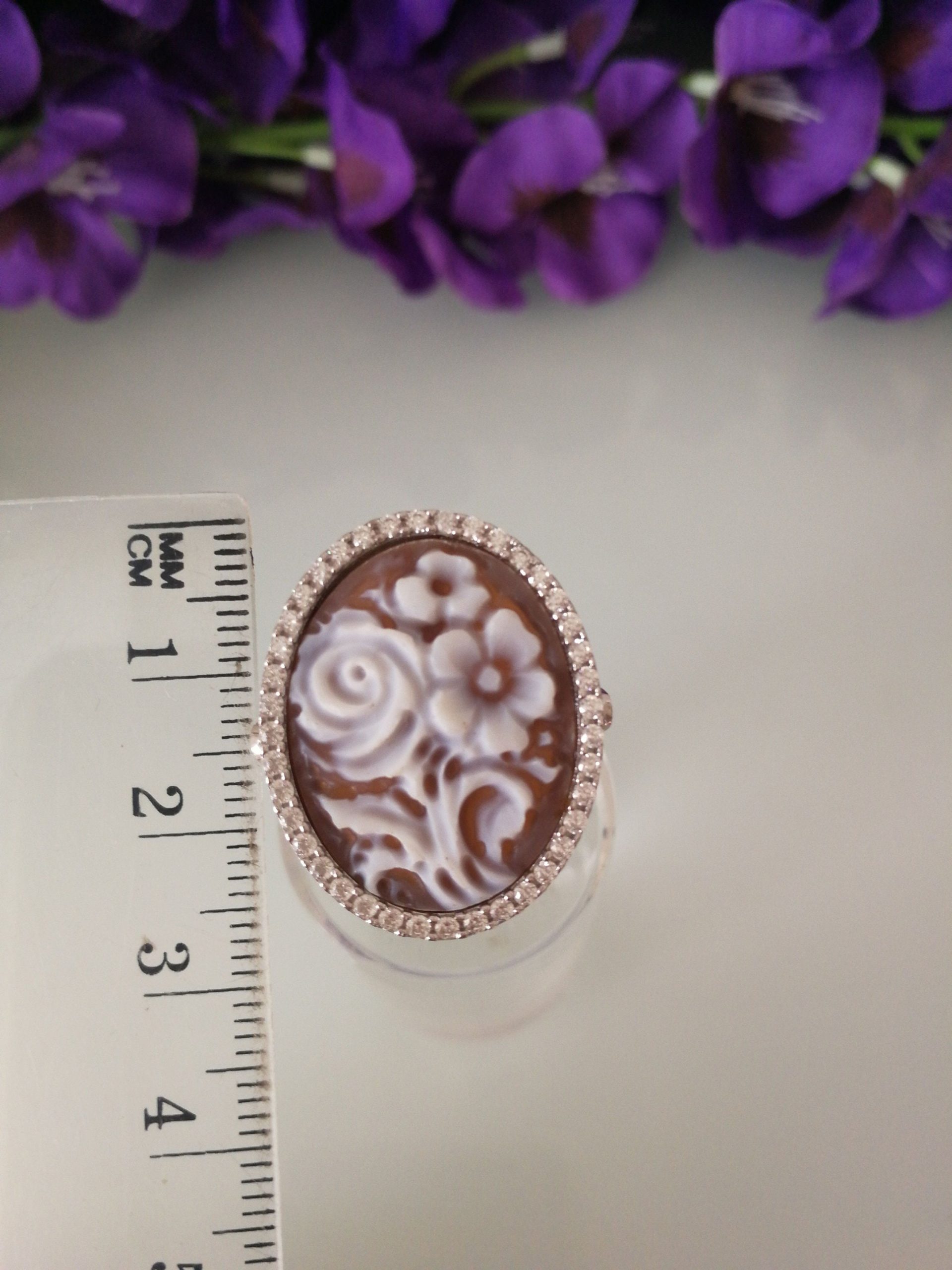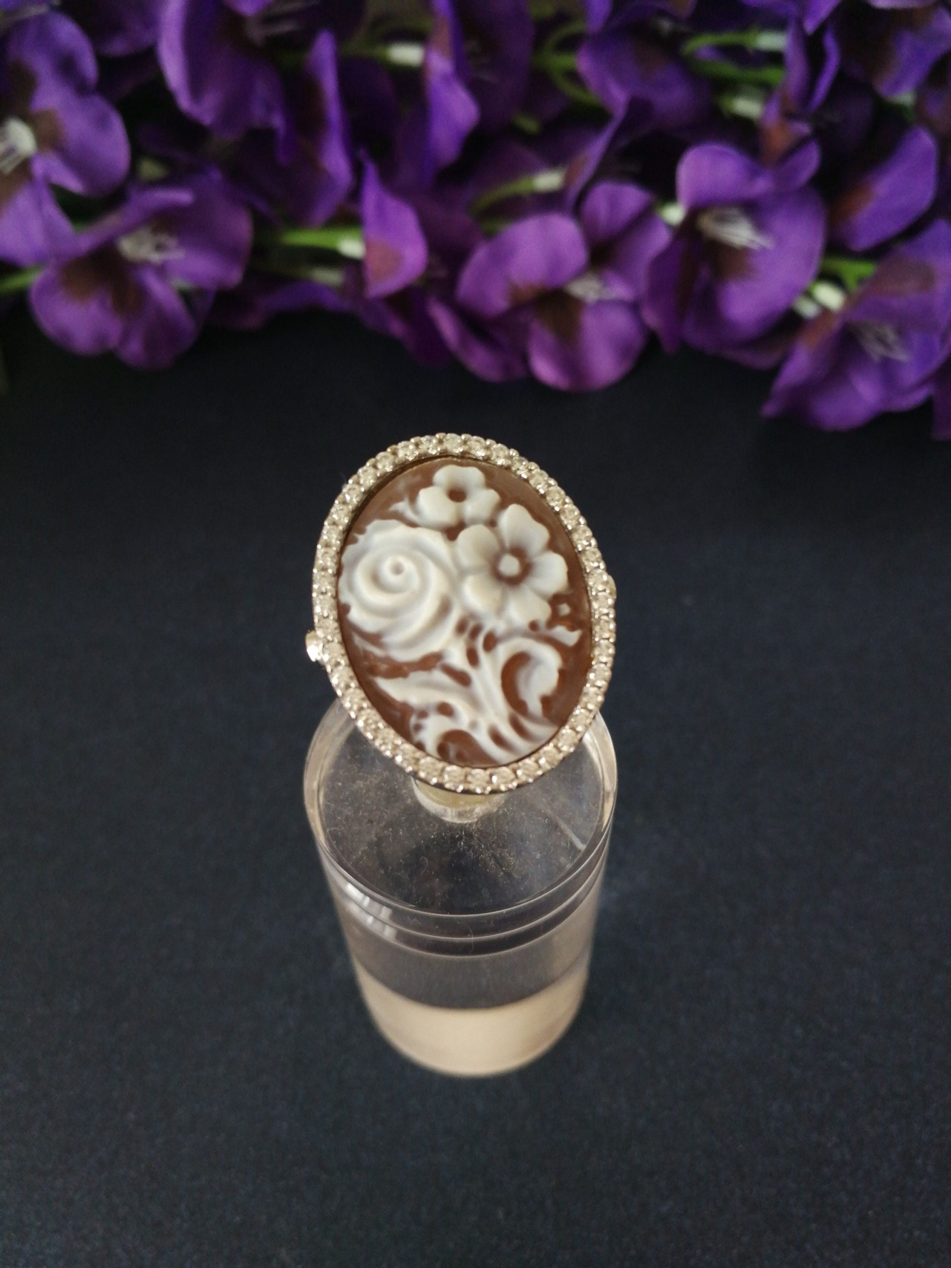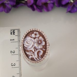Anello elegante classico con cammeo conchiglia originale di Torre del Greco Italia che raffigura fiori ,montatura in argento 925 a lavorazione artigianale contornata da zirconi bianchi. Misura lunghezza 3 cm/ Larghezza 2 cm. Misura anello regolabile.Cammeo perfetto.