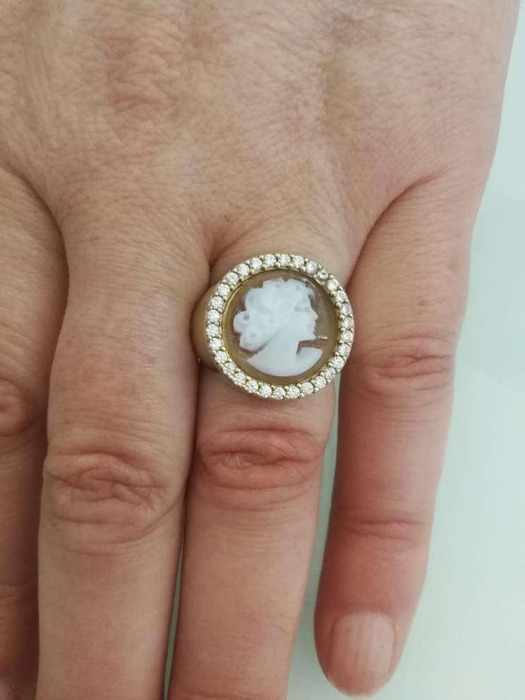 Anello cammeo conchiglia sardonica, argento 925 e zirconi , gioielli italiani