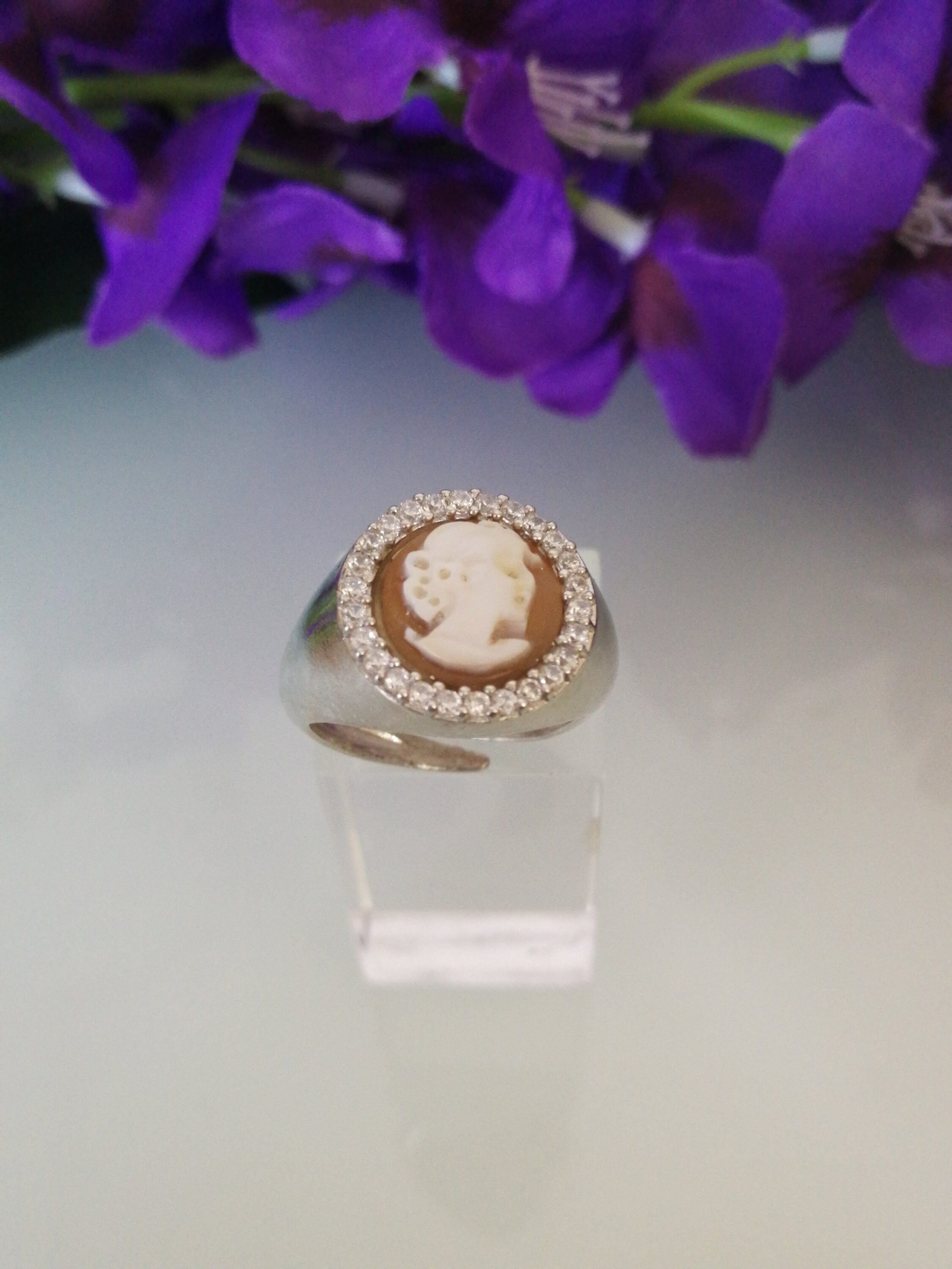 Anello cammeo fiore in conchiglia sardonica con zirconi , gioielli italiani