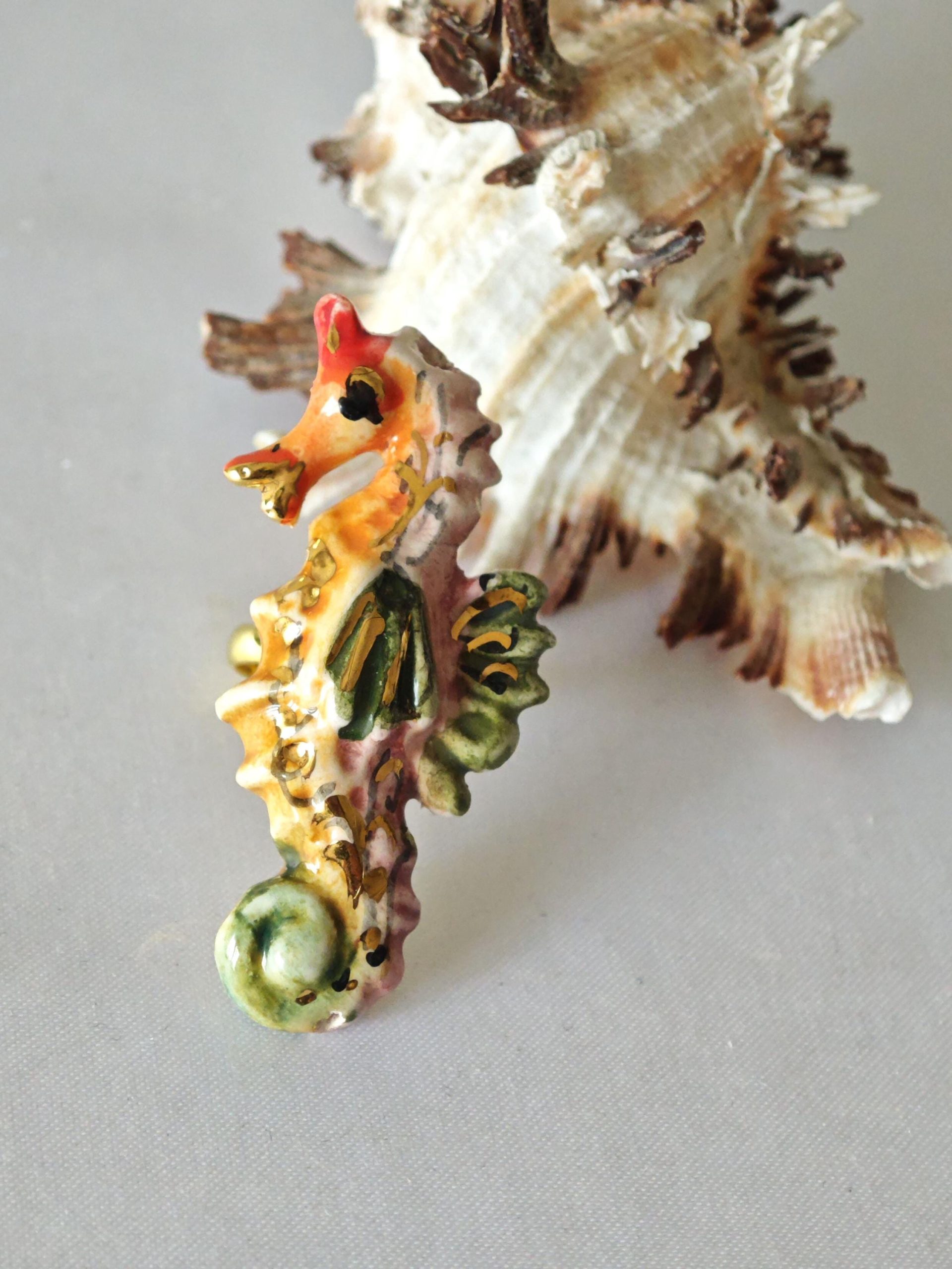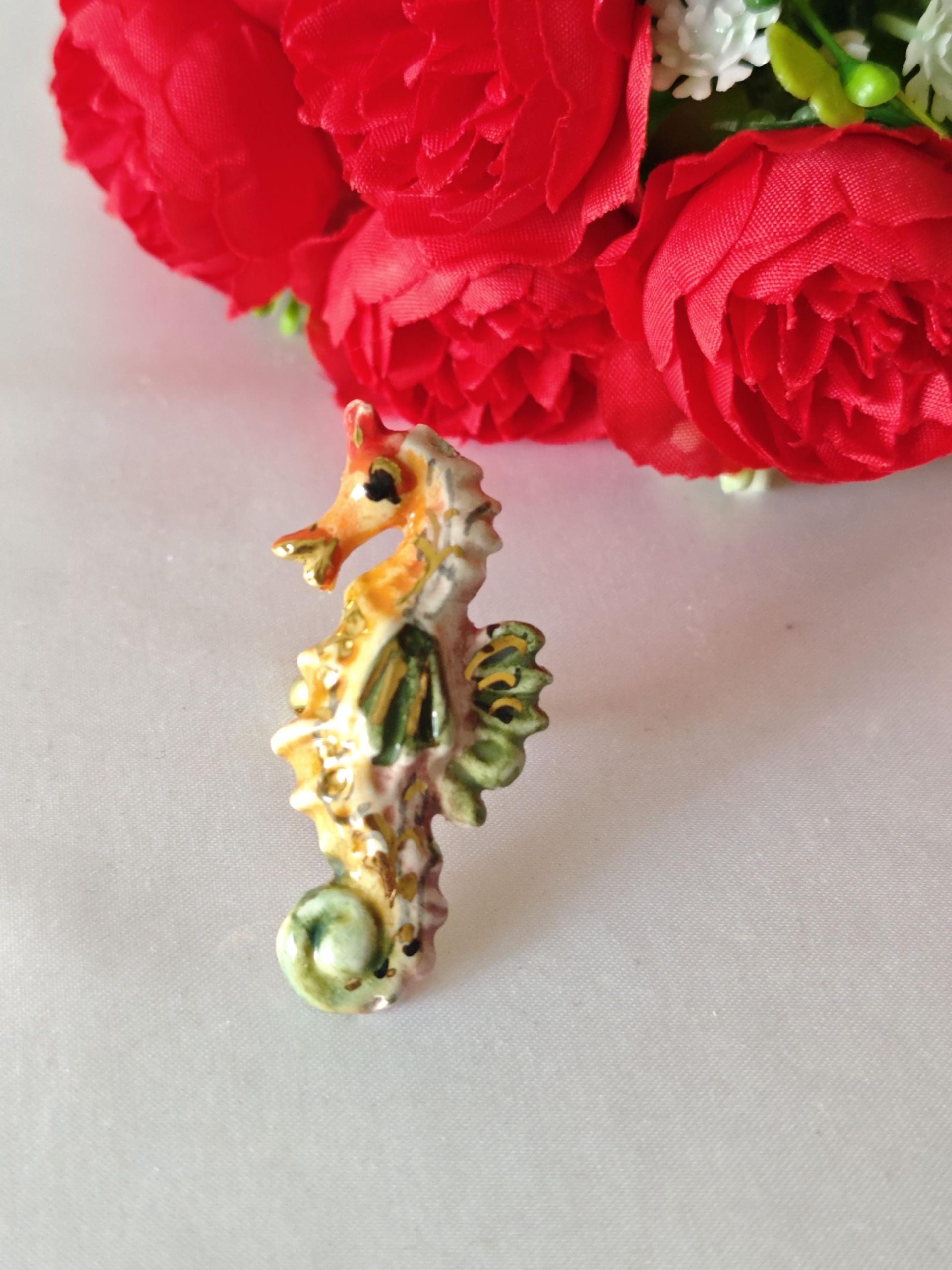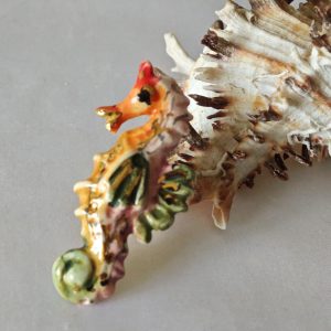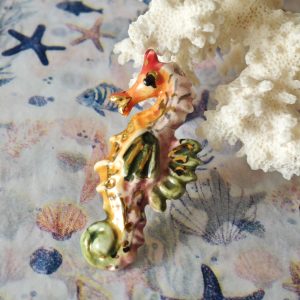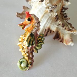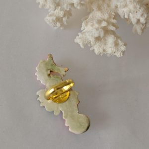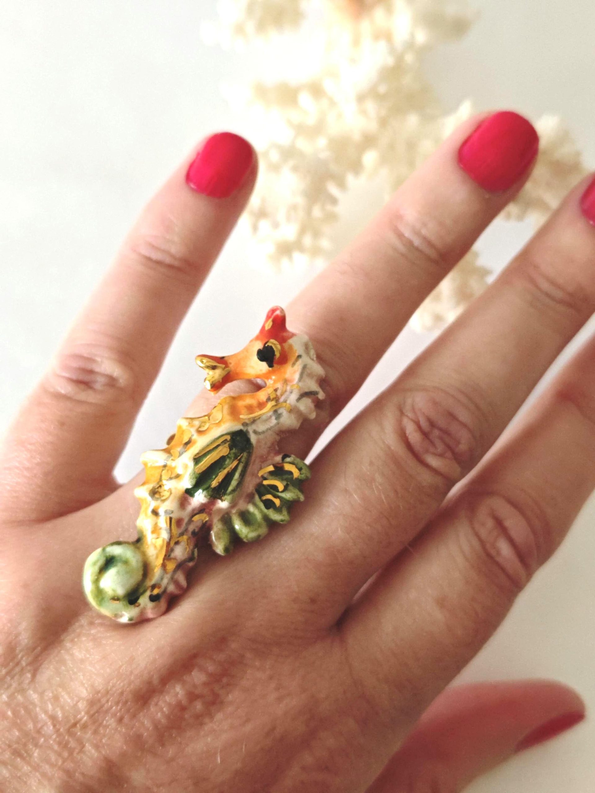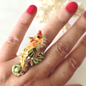 Anello in ottone con cavalluccio marino in ceramica di Caltagirone realizzata e dipinta a mano a mano, 5 cm dimensioni.